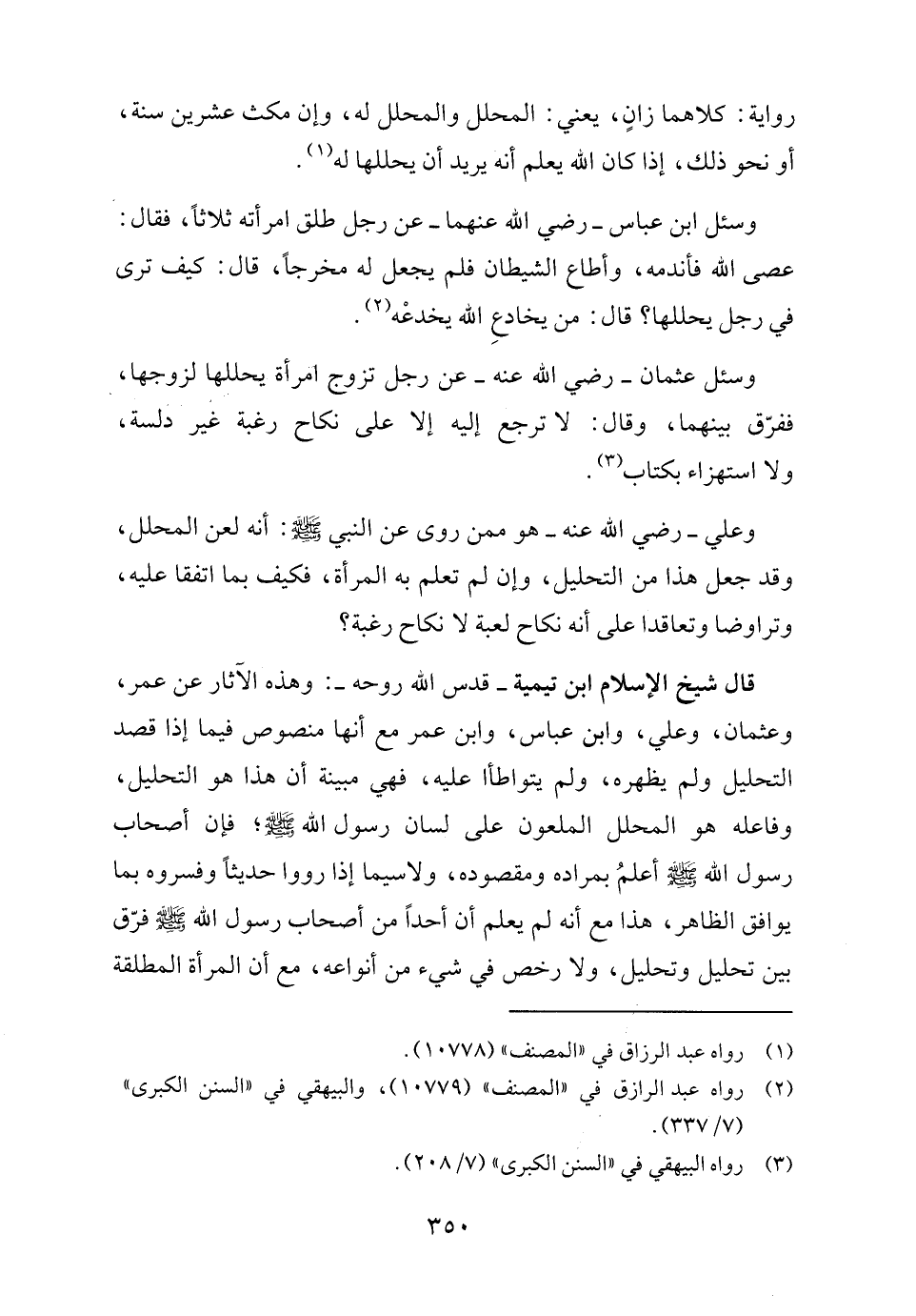قال شيخ الإسلام ابن تيمية -قدس الله روحه-: وهذه الآثار عن عمر، وعثمان، وعلي، وابن عباس، وابن عمر مع أما منصوص فيما إذا قصد التحليل ولم يظهره، ولم يتواطأ عليه، فهي مبينة أن هذا هو التحليل، وفاعله هو المحلل الملعون على لسان رسول الله - صلى الله عليه وسلم -، فإن أصحاب رسول الله - صلى الله عليه وسلم - أعلمُ بمراده ومقصوده، ولا سيما إذا رووا حديثًا وفسروه بما يوافق الظاهر، هذا مع أنه لم يعلم أن أحدًا من أصحاب رسول الله - صلى الله عليه وسلم - فرّق بين تحليل وتحليل، ولا رخص في شيء من أنواعه، مع أن المرأة المطلقة