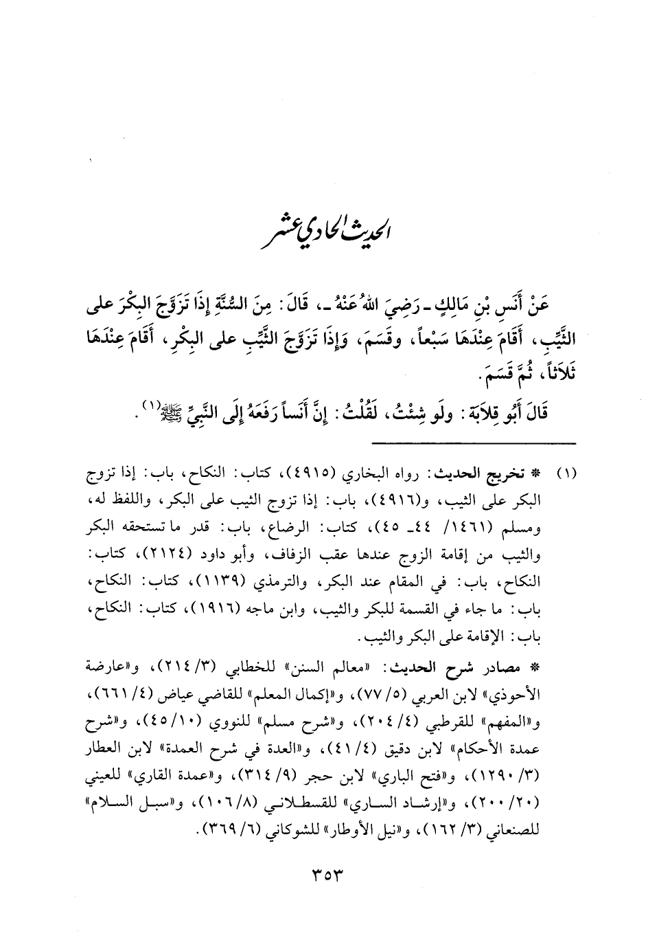 عَنْ أَنَسِ بْنِ مَالِكٍ - رَضِيَ اللهُ عَنْهُ -، قَالَ: مِنَ السُّنَّةِ إِذَا تَزَوَّجَ البِكْرَ على الثَّيِّبِ، أَقَامَ عِنْدَهَا سَبْعًا، وقَسَمَ، وَإِذَا تَزَوَّجَ الثَّيِّبِ على البِكْرِ، أَقَامَ عِنْدَهَا ثَلَاثًا، ثُمَّ قَسَمَ.