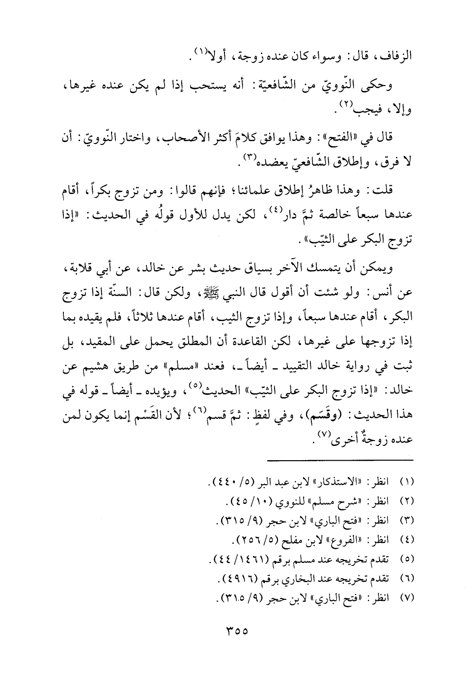ويمكن أن يتمسك الآخر بسياق حديث بشر عن خالد، عن أبي قلابة، عن أنس: ولو شئت أن أقول قال النبي - صلى الله عليه وسلم -، ولكن قال: السنّة إذا تزوج البكر، أقام عندها سبعًا، وإذا تزوج الثيب، أقام عندها ثلاثًا، فلم يقيده بما إذا تزوجها على غيرها، لكن القاعدة أن المطلق يحمل على المقيد، بل ثبت في رواية خالد التقييد -أيضًا-، فعند "مسلم" من طريق هشيم عن خالد: "إذا تزوج البكر على الثيّب" الحديث (٥)، ويؤيده -أيضًا- قوله في هذا الحديث: (وقَسَم)، وفي لفظٍ: ثمَّ قسم (٦)؛ لأن القَسْم إنما يكون لمن عنده زوجةٌ أخرى (٧).