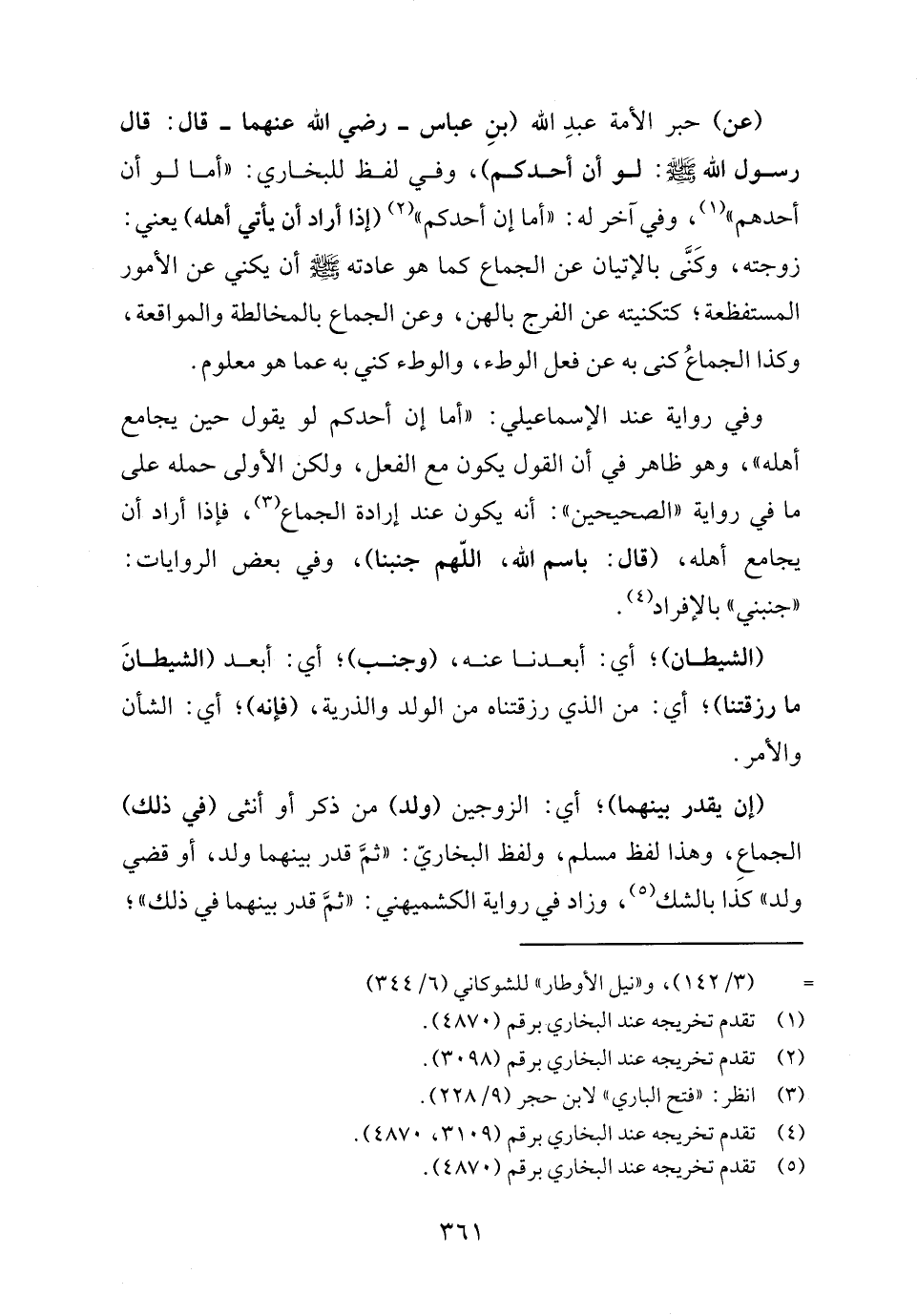 وفي رواية عند الإسماعيلي: "أما إن أحدكم لو يقول حين يجامع أهله"، وهو ظاهر في أن القول يكون مع الفعل، ولكن الأولى حمله على ما في رواية "الصحيحين": أنه يكون عند إرادة الجماع (٣)، فإذا أراد أن يجامع أهله، (قال: باسم الله، اللهم جنبنا)، وفي بعض الروايات: "جنبني" بالإفراد (٤).