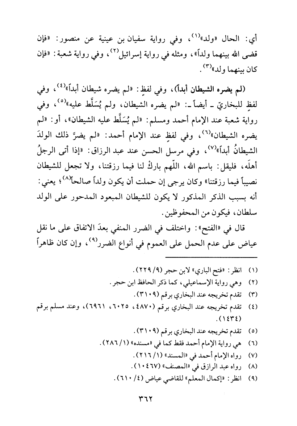 (لم يضره الشيطان أبدًا)، وفي لفظٍ: "لم يضره شيطان أبدًا" (٤)، وفي لفظٍ للبخاري -أيضًا-: "لم يضره الشيطان، ولم يُسَلَّط عليه" (٥)، وفي رواية شعبة عند الإمام أحمد ومسلم: "لم يُسَلَّط عليه الشيطان"، أو: "لم يضره الشيطان" (٦)، وفي لفظٍ عند الإمام أحمد: "لم يضرَّ ذلك الولدَ الشيطانُ أبدًا" (٧)، وفي مرسل الحسن عند عبد الرزاق: "إذا أتى الرَّجلُ أهلَه، فليقل: باسم الله، اللهم باركْ لنا فيما رزقتنا، ولا تجعل للشيطان نصيبًا فيما رزقتنا" وكان يرجى إن حملت أن يكون ولدًا صالحًا (٨)؛ يعني: أنه بسبب الذكر المذكور لا يكون للشيطان المبعود المدحور على الولد سلطان، فيكون من المحفوظين.