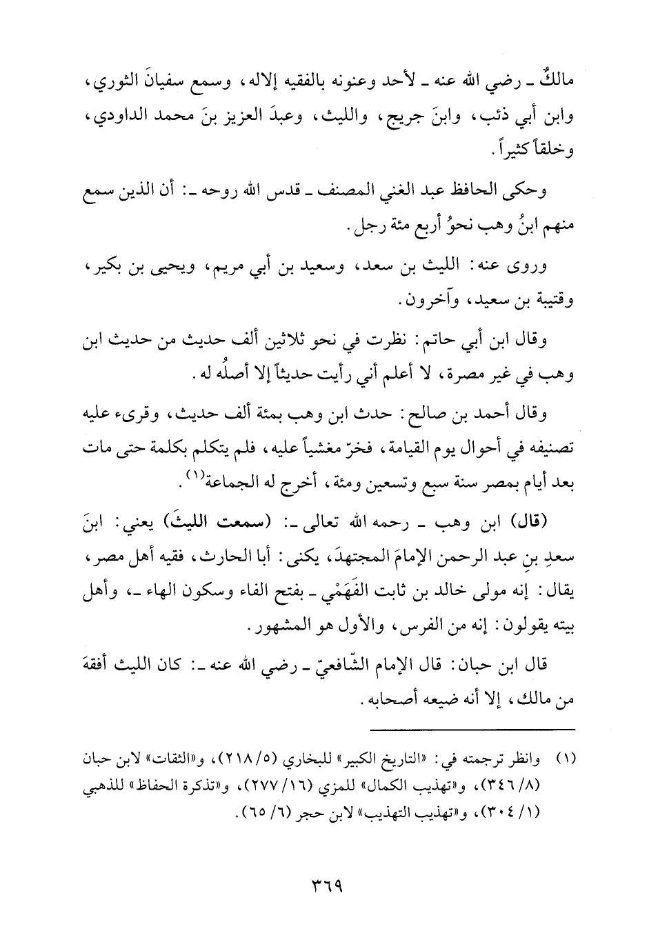 قال ابن حبان: قال الإمام الشّافعيّ - رضي الله عنه -: كان الليث أفقهَ من مالك، إلا أنه ضيعه أصحابه.