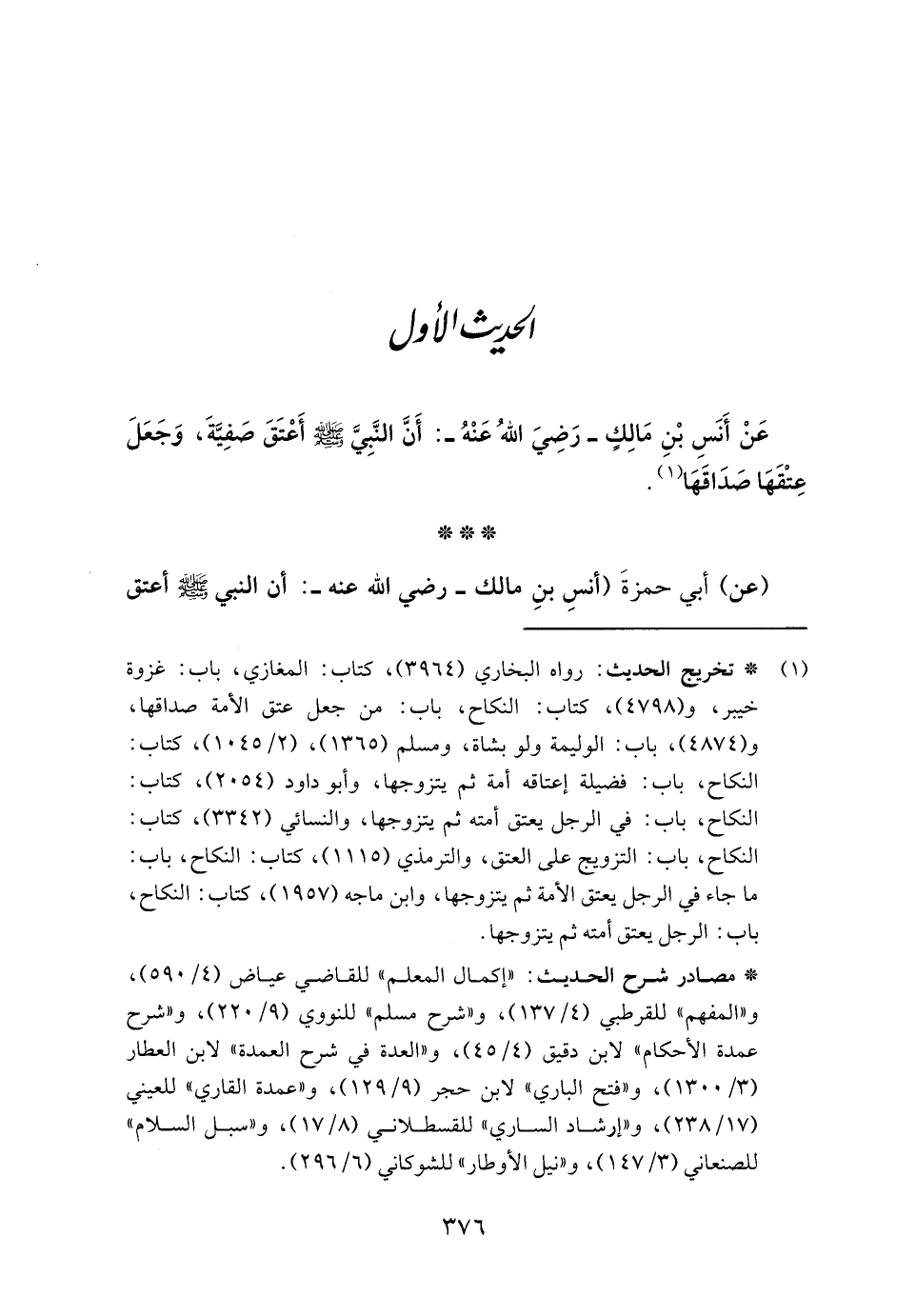 عَنْ أَنَسِ بْنِ مَالِكٍ - رَضِيَ اللهُ عَنْهُ -: أَنَّ النَّبِيَّ - صلى الله عليه وسلم - أعْتَقَ صَفِيَّةَ، وَجَعَلَ عِتْقَهَا صَدَاقَهَا (١).