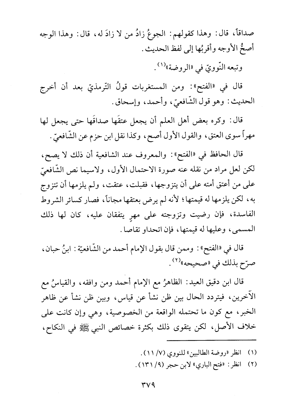 قال الحافظ في "الفتح": والمعروف عند الشافعية أن ذلك لا يصح، لكن لعل مراد من نقله عنه صورة الاحتمال الأول، ولاسيما نص الشّافعيّ على من أعتق أمته على أن يتزوجها، فقبلت، عتقت، ولم يلزمها أن تتزوج به، لكن يلزمها له قيمتها؛ لأنه لم يرض بعتقها مجانًا، فصار كسائر الشروط الفاسدة، فإن رضيت وتزوجته على مهرٍ يتفقان عليه، كان لها ذلك المسمى، وعليها له قيمتها، فإن اتحداو تقاصا.