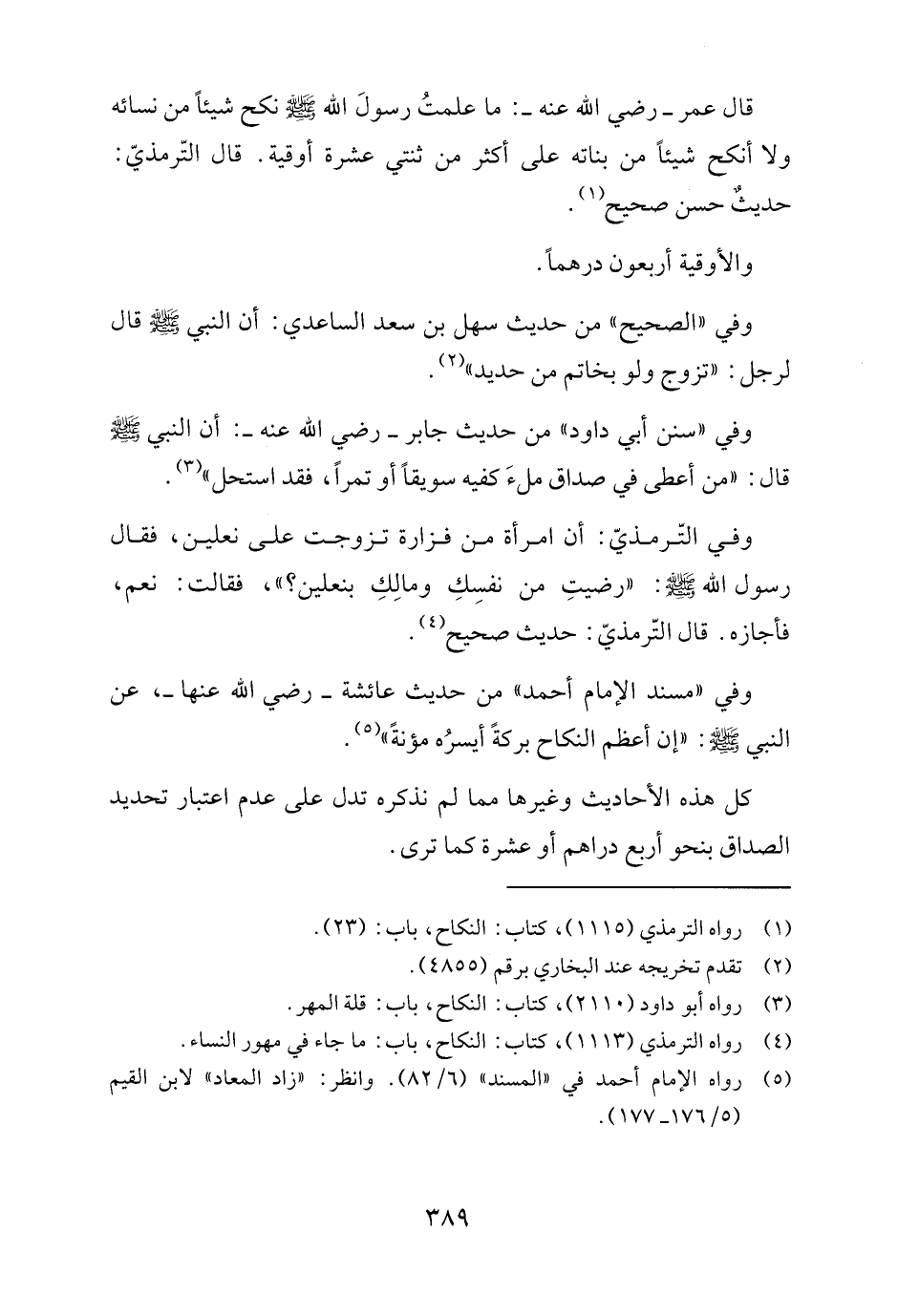 قال عمر - رضي الله عنه -: ما علمتُ رسولَ الله - صلى الله عليه وسلم - نكح شيئًا من نسائه ولا أنكح شيئًا من بناته على أكثر من ثنتي عشرة أوقية. قال الترمذي: حديثٌ حسن صحيح (١).