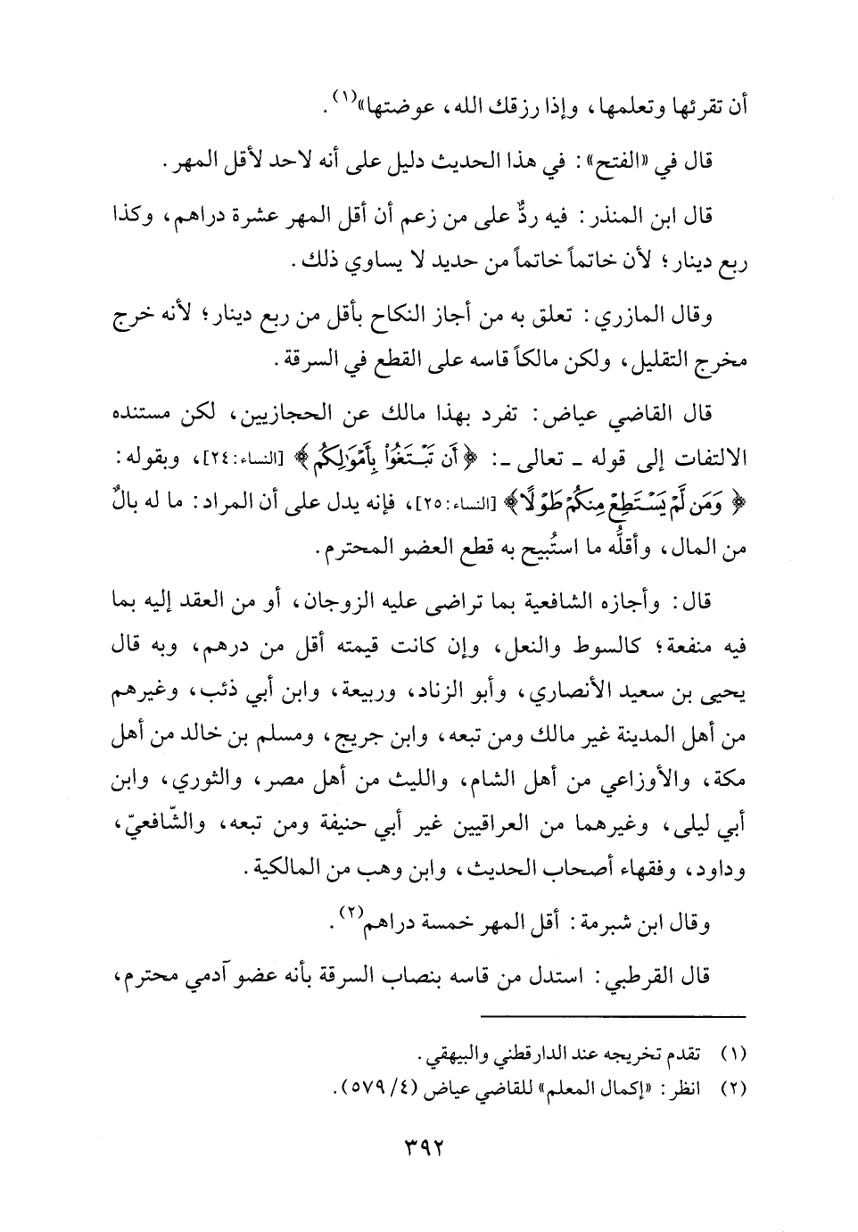 قال: القاضي عياض: تفرد بهذا مالك عن الحجازيين، لكن مستنده الالتفات إلى قوله -تعالى-: {أَنْ تَبْتَغُوا بِأَمْوَالِكُمْ} [النساء: ٢٤]، وبقوله: {وَمَنْ لَمْ يَسْتَطِعْ مِنْكُمْ طَوْلًا} [النساء: ٢٥]، فإنه يدل على أن المراد: ما له بالٌ من المال، وأقلّه ما استُبيح به قطع العضو المحترم.
