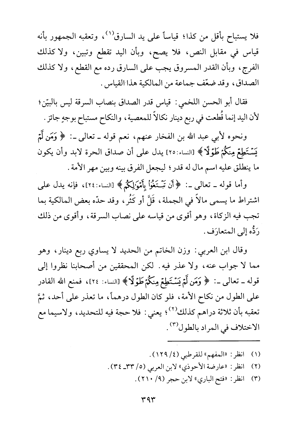 وقال ابن العربي: وزن الخاتم من الحديد لا يساوي ربع دينار، وهو مما لا جواب عنه، ولا عذر فيه. لكن المحققين من أصحابنا نظروا إلى قوله -تعالى-: {وَمَنْ لَمْ يَسْتَطِعْ مِنْكُمْ طَوْلًا} [النساء: ٢٥]، فمنع الله القادر على الطول من نكاح الأمة، فلو كان الطول درهمًا، ما تعذر على أحد، ثمَّ تعقبه بأن ثلاثة دراهم كذلك (٢)، يعني: فلا حجة فيه للتحديد، ولاسيما مع الاختلاف في المراد بالطول (٣).
