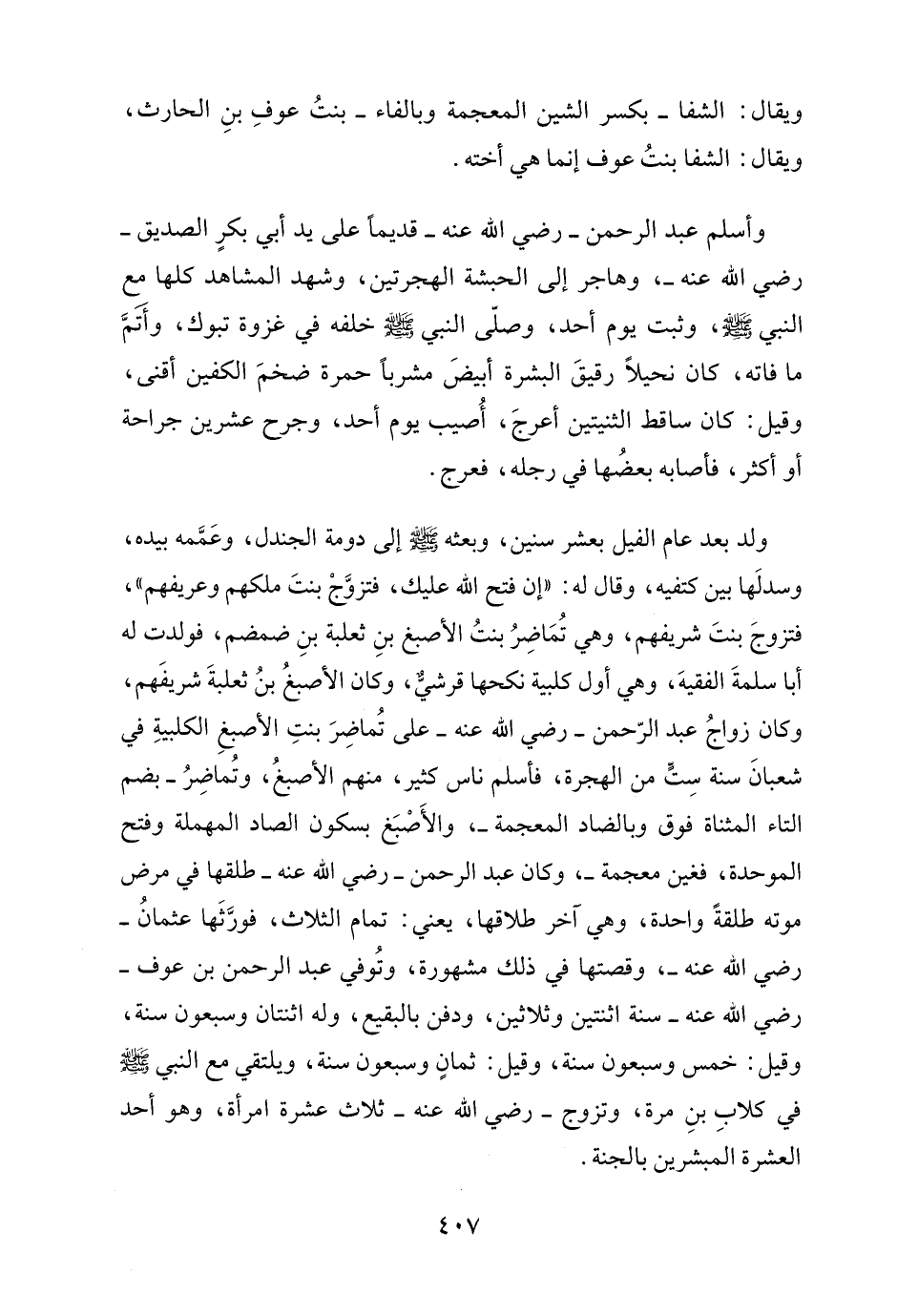 ولد بعد عام الفيل بعشر سنين، وبعثه - صلى الله عليه وسلم - إلى دومة الجندل، وعَمَّمه بيده، وسدلَها بين كتفيه، وقال له: "إن فتح الله عليك، فتزوَّجْ بنتَ ملكهم وعريفهم"، فتزوجَ بنتَ شريفهم، وهي تُمَاضِرُ بنتُ الأصبغ بنِ ثعلبة بنِ ضمضم، فولدت له أبا سلمةَ الفقيهَ، وهي أول كلبية نكحها قرشيٌّ، وكان الأصبغُ بنُ ثعلبةَ شريفَهم، وكان زواجُ عبد الرّحمن - رضي الله عنه - على تُماضِرَ بنتِ الأصبغِ الكلبيةِ في شعبانَ سنة سِتٍّ من الهجرة، فأسلم ناس كثير، منهم الأصبغُ، وتُماضِرُ -بضم التاء المثناة فوق وبالضاد المعجمة-، والأَصْبَغ بسكون الصاد المهملة وفتح الموحدة، فغين معجمة-، وكان عبد الرحمن - رضي الله عنه - طلقها في مرض موته طلقةً واحدة، وهي آخر طلاقها، يعني: تمام الثلاث، فورَّثَها عثمانُ - رضي الله عنه -، وقصتها في ذلك مشهورة، وتُوفي عبد الرحمن بن عوف - رضي الله عنه - سنة اثنتين وثلاثين، ودفن بالبقيع، وله اثنتان وسبعون سنة، وقيل: خمس وسبعون سنة، وقيل: ثمانٍ وسبعون سنة، ويلتقي مع النبي - صلى الله عليه وسلم - في كلابِ بنِ مرة، وتزوج - رضي الله عنه - ثلاث عشرة امرأة، وهو أحد العشرة المبشرين بالجنة.