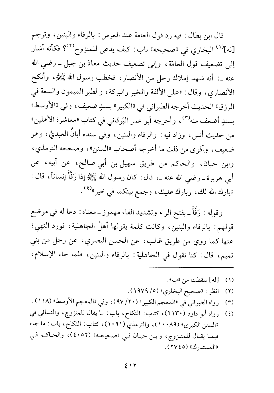 قال ابن بطّال: فيه رد قول العامة عند العرس: بالرفاء والبنين، وترجم [له] (١) البخاري في "صحيحه" باب: كيف يدعى للمتزوج (٢)؟ فكأنه أشار إلى تضعيف قول العامّة، وإلى تضعيف حديث معاذ بن جبل - رضي الله عنه -: أنه شهد إملاك رجل من الأنصار، فخطب رسول الله - صلى الله عليه وسلم -، وأنكح الأنصاري، وقال: "على الألفة والخير والبركة، والطير الميمون والسعة في الرزق" الحديث أخرجه الطبراني في "الكبير" بسندٍ ضعيف، وفي "الأوسط" بسندٍ أضعف منه (٣)، وأخرجه أبو عمر البَرقاني في كتاب "معاشرة الأهلين" من حديث أنس، وزاد فيه: والرفاء والبنين، وفي سنده أبانُ العبديُّ، وهو ضعيف، وأقوى من ذلك ما أخرجه أصحاب "السنن"، وصححه الترمذي، وابن حبان، والحاكم من طريق سهيل بن أبي صالح، عن أبيه، عن أبي هريرة - رضي الله عنه -، قال: كان رسول الله - صلى الله عليه وسلم - إذا رَفَّأَ إنسانًا، قال: "بارك الله لك، وبارك عليك، وجمع بينكما في خير" (٤).