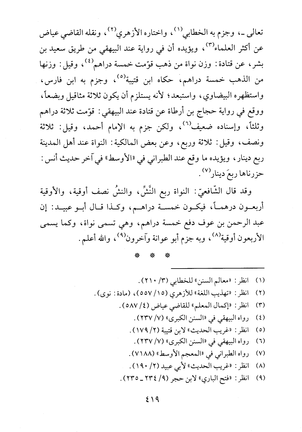 عبد الرحمن بن عوف دفع خمسة دراهم، وهي تسمى نواة، وكما يسمى الأربعون أوقية (٨)، وبه جزم أبو عو انة وآخرون (٩)، والله أعلم.