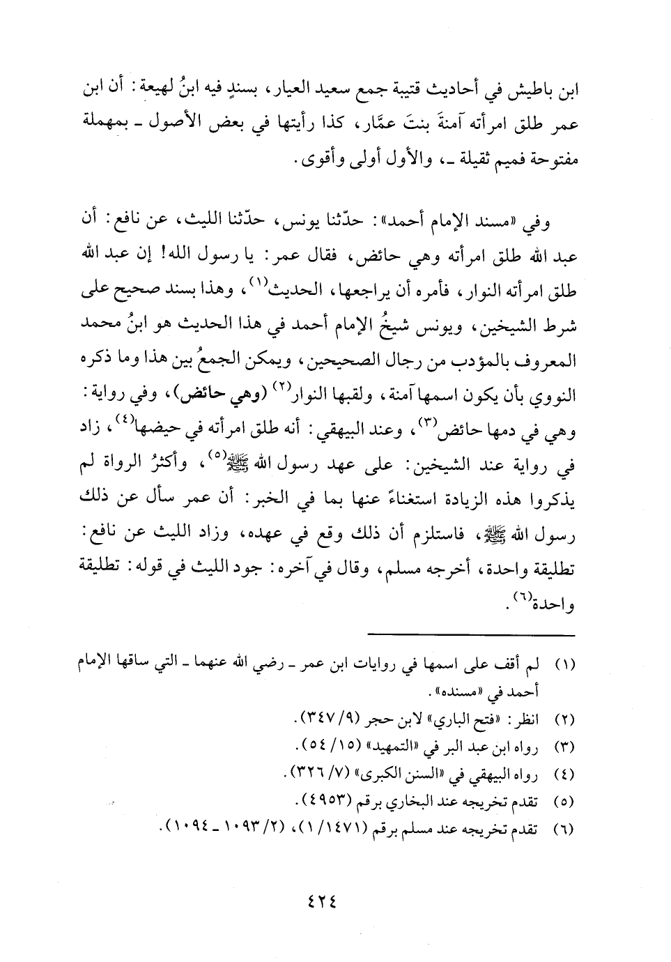 وفي "مسند الإمام أحمد": حدثنا يونس، حدثنا الليث، عن نافع: أن عبد الله طلق امرأته وهي حائض، فقال عمر: يا رسول الله! إن عبد الله طلق امرأته النوار، فأمره أن يراجعها، الحديث (١)، وهذا بسند صحيح على شرط الشيخين، ويونس شيخُ الإمام أحمد في هذا الحديث هو ابنُ محمد المعروف بالمؤدب من رجال الصحيحين، ويمكن الجمعُ بين هذا وما ذكره النووي بأن يكون اسمها آمنة، ولقبها النوار (٢) (وهي حائض)، وفي رواية: وهي في دمها حائض (٣)، وعند البيهقي: أنه طلق امرأته في حيضها (٤)، زاد في رواية عند الشيخين: على عهد رسول الله - صلى الله عليه وسلم - (٥)، وأكثرُ الرواة لم يذكروا هذه الزيادة استغناءً عنها بما في الخبر: أن عمر سأل عن ذلك رسول الله - صلى الله عليه وسلم -، فاستلزم أن ذلك وقع في عهده، وزاد الليث عن نافع: تطليقة واحدة، أخرجه مسلم، وقال في آخره: جود الليث في قوله: تطليقة واحدة (٦).