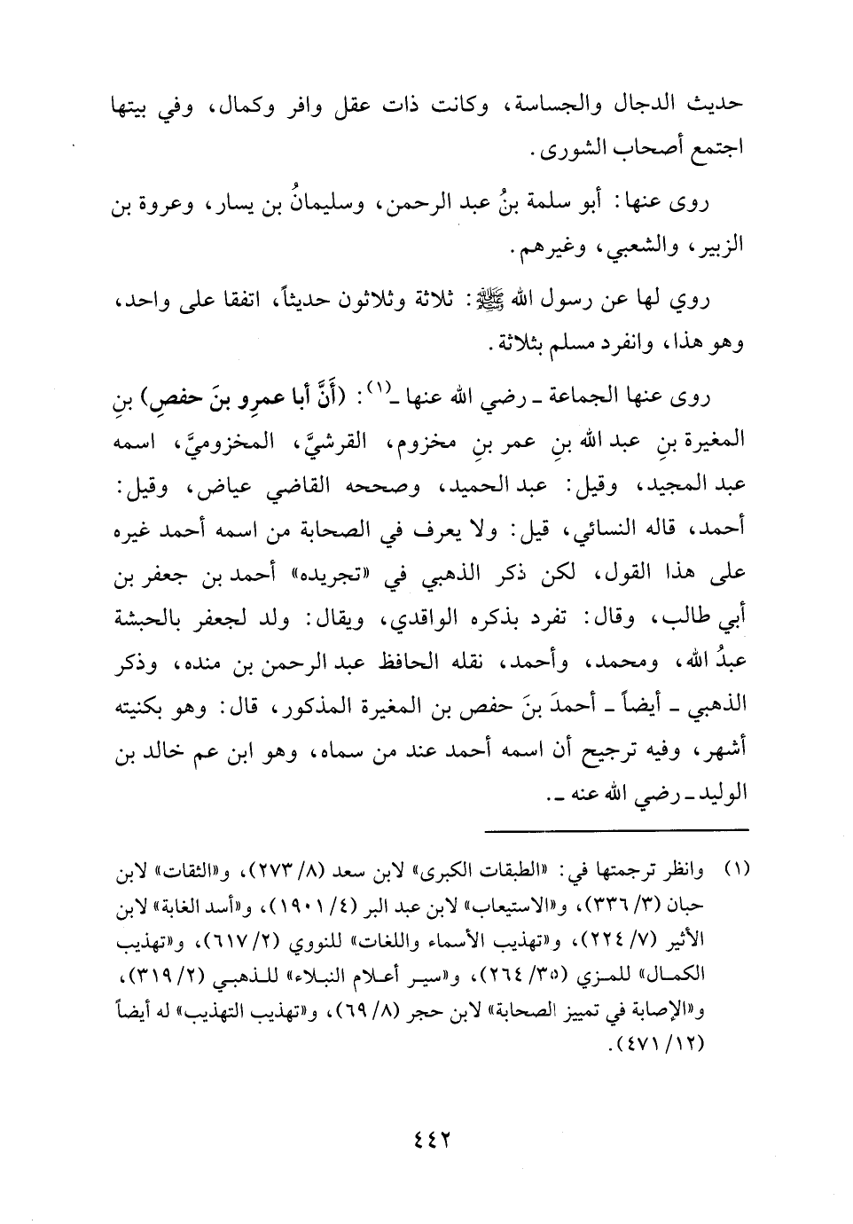 روى عنها الجماعة - رضي الله عنها - (١): (أَنَّ أبا عمرِو بنَ حفصِ) بنِ المغيرة بنِ عبد الله بنِ عمر بنِ مخزوم، القرشيَّ، المخزوميَّ، اسمه عبد المجيد، وقيل: عبد الحميد، وصححه القاضي عياض، وقيل: أحمد، قاله النسائي، قيل: ولا يعرف في الصحابة من اسمه أحمد غيره على هذا القول، لكن ذكر الذهبي في "تجريده" أحمد بن جعفر بن أبي طالب، وقال: تفرد بذكره الواقدي، ويقال: ولد لجعفر بالحبشة عبدُ الله، ومحمد، وأحمد، نقله الحافظ عبد الرحمن بن منده، وذكر الذهبي -أيضًا- أحمدَ بنَ حفص بن المغيرة المذكور، قال: وهو بكنيته أشهر، وفيه ترجيح أن اسمه أحمد عند من سماه، وهو ابن عم خالد بن الوليد - رضي الله عنه -.
