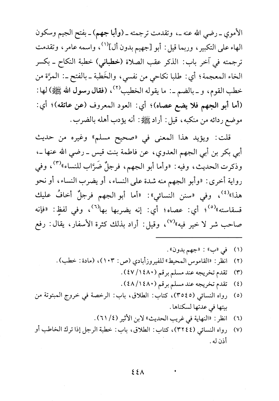 قلت: ويؤيد هذا المعنى في "صحيح مسلم" وغيره من حديث أبي بكر بن أبي الجهم العدوي، عن فاطمة بنت قيس - رضي الله عنها -، وذكرت الحديث، وفيه: "وأما أبو الجهم، فرجلٌ ضَرَّاب للنساء" (٣)، وفي رواية أخرى: "وأبو الجهم منه شدة على النساء، أو يضرب النساء، أو نحو هذا" (٤)، وفي "سنن النسائي": "أما أبو الجهم فرجلٌ أخافُ عليك قسقاسته" (٥)؛ أي: عصاه، أي: إنه يضربها بها (٦)، وفي لفظٍ: "فإنه صاحب شر لا خير فيه" (٧)، وقيل: أراد بذلك كثرة الأسفار، يقال: رفع