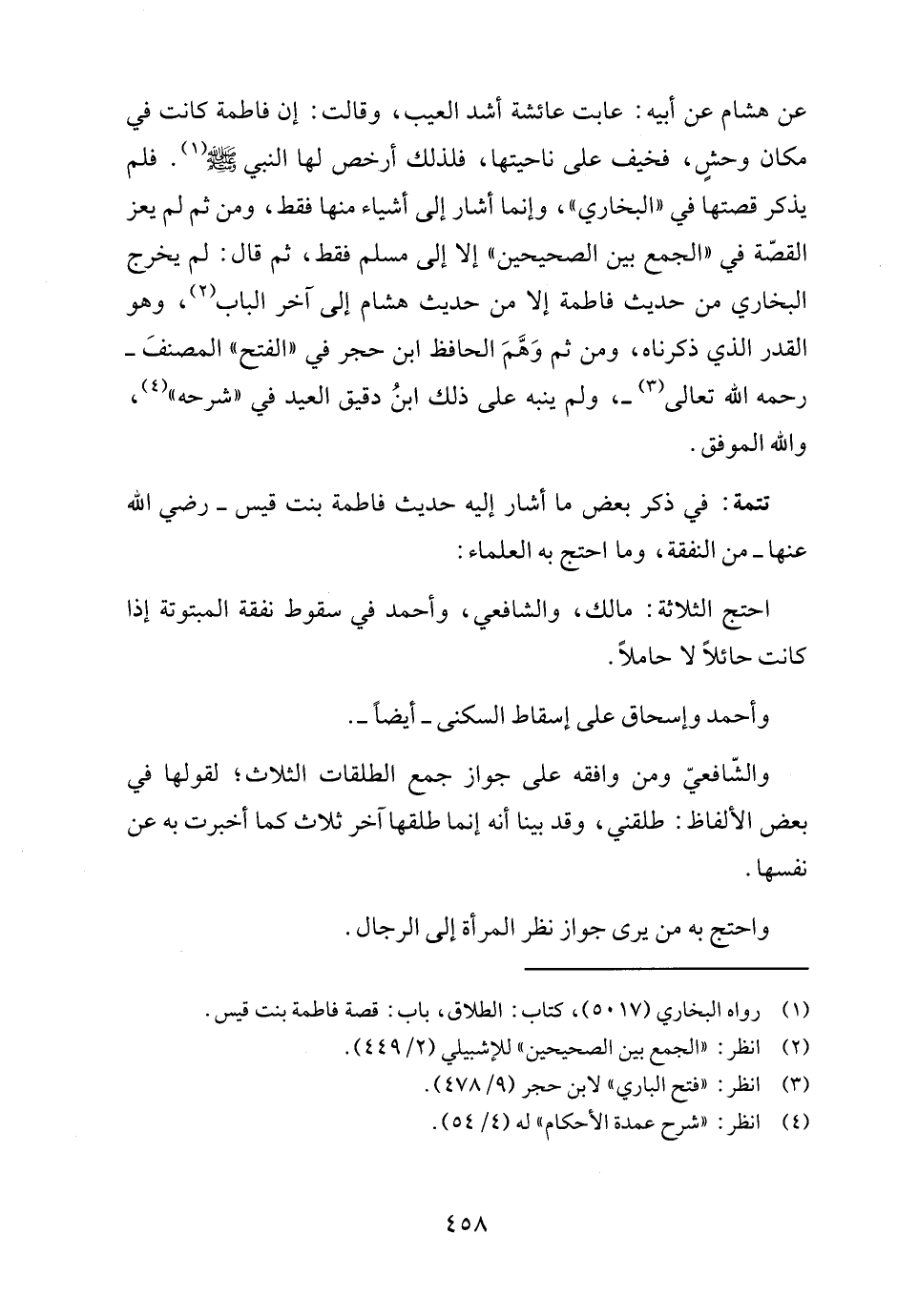 عن هشام عن أبيه: عابت عائشة أشد العيب، وقالت: إن فاطمة كانت في مكان وحشٍ، فخيف على ناحيتها، فلذلك أرخص لها النبي - صلى الله عليه وسلم - (١). فلم يذكر قصتها في "البخاري"، وإنما أشار إلى أشياء منها فقط، ومن ثمّ لم يعز القصّة في "الجمع بين الصحيحين" إلا إلى مسلم فقط، ثمّ قال: لم يخرج البخاري من حديث فاطمة إلا من حديث هشام إلى آخر الباب (٢)، وهو القدر الذي ذكرناه، ومن ثمّ وَهَّمَ الحافظ ابن حجر في "الفتح" المصنفَ -رحمه الله تعالى (٣) -، ولم ينبه على ذلك ابنُ دقيق العيد في "شرحه" (٤)، والله الموفق.