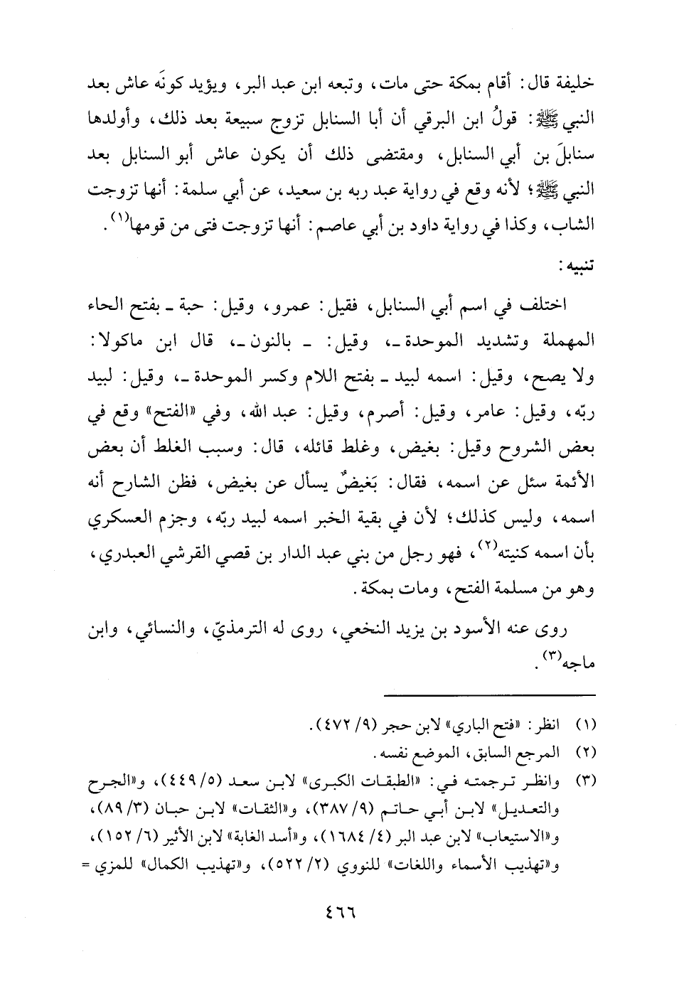 خليفة قال: أقام بمكة حتى مات، وتبعه ابن عبد البر، ويؤيد كونَه عاش بعد النبي: قول ابن البرقي أن أبا السنابل تزوج سبيعة بعد ذلك، وأولدها سنابلَ بن أبي السنابل، ومقتضى ذلك أن يكون عاش أبو السنابل بعد النبي - صلى الله عليه وسلم -؛ لأنه وقع في رواية عبد ربه بن سعيد، عن أبي سلمة: أنها تزوجت الشاب، وكذا في رواية داود بن أبي عاصم: أنها تزوجت فتى من قومها (١).