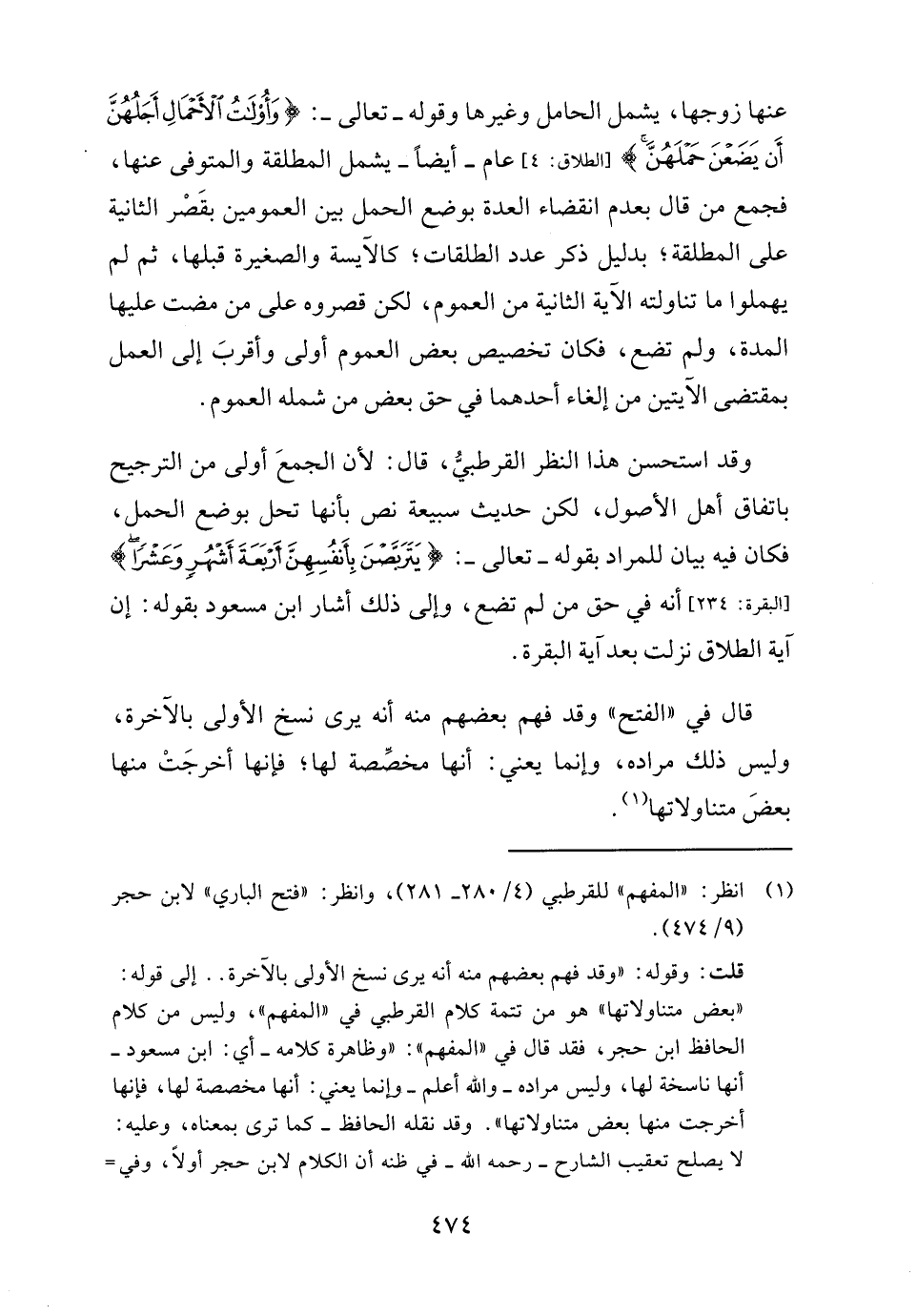 وقد استحسن هذا النظر القرطبيُّ، قال: لأن الجمعَ أولى من الترجيح باتفاق أهل الأصول، لكن حديث سبيعة نص بأنها تحل بوضع الحمل، فكان فيه بيان للمراد بقوله -تعالى-: {يَتَرَبَّصْنَ بِأَنْفُسِهِنَّ أَرْبَعَةَ أَشْهُرٍ وَعَشْرًا} [البقرة: ٢٣٤]، أنه في حق من لم تضع، وإلى ذلك أشار ابن مسعود بقوله: إن آية الطلاق نزلت بعد آية البقرة.