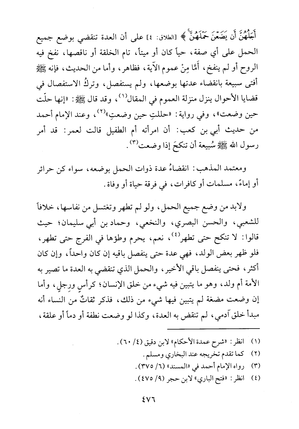 أَجَلُهُنَّ أَنْ يَضَعْنَ حَمْلَهُنَّ} [الطلاق: ٤] على أن العدة تنقضي بوضع جميع الحمل على أي صفة، حيًا كان أو ميتًا، تام الخلقة أو ناقصها، نفخ فيه الروح أو لم ينفخ، أَمَّا مِنْ عموم الآية، فظاهر، وأما من الحديث، فإنه - صلى الله عليه وسلم - أفتى سبيعة بانقضاء عدتها بوضعها، ولم يستفصل، وتركُ الاستفصال في قضايا الأحوال ينزل منزلة العموم في المقال (١)، وقد قال - صلى الله عليه وسلم -: "إنها حلّت حين وضعت"، وفي رواية: "حللتِ حين وضعتِ" (٢)، وعند الإمام أحمد من حديث أبي بن كعب: أن امرأته أم الطفيل قالت لعمر: قد أمر رسول الله - صلى الله عليه وسلم - سُبيعة أن تنكحَ إذا وضعت (٣).