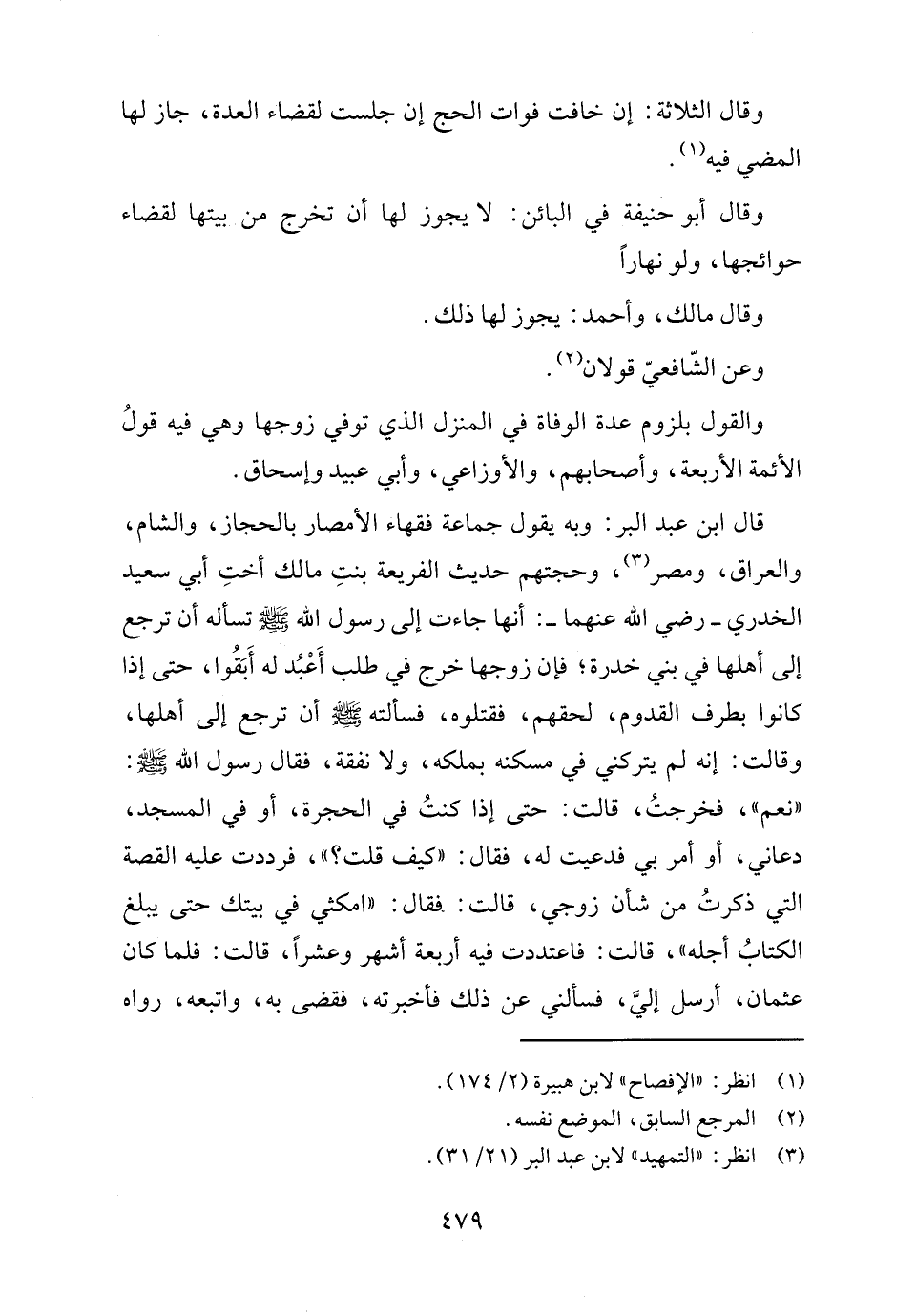 قال ابن عبد البر: وبه يقول جماعة فقهاء الأمصار بالحجاز، والشام، والعراق، ومصر (٣)، وحجتهم حديث الفريعة بنتِ مالك أختِ أبي سعيد الخدري - رضي الله عنهما -: أنها جاءت إلى رسول الله - صلى الله عليه وسلم - تسأله أن ترجع إلى أهلها في بني خدرة، فإن زوجها خرج في طلب أَعْبُد له أَبَقُوا، حتى إذا كانوا بطرف القدوم، لحقهم، فقتلوه، فسألته - صلى الله عليه وسلم - أن ترجع إلى أهلها، وقالت: إنه لم يتركني في مسكنه بملكه، ولا نفقة، فقال رسول الله - صلى الله عليه وسلم -: "نعم"، فخرجتُ، قالت: حتى إذا كنتُ في الحجرة، أو في المسجد، دعاني، أو أمر بي فدعيت له، فقال: "كيف قلت؟ "، فرددت عليه القصة التي ذكرتُ من شأن زوجي، قالت: فقال: "امكثي في بيتك حتى يبلغ الكتابُ أجله"، قالت: فاعتددت فيه أربعة أشهر وعشرًا، قالت: فلما كان عثمان، أرسل إليَّ، فسألني عن ذلك فأخبرته، فقضى به، واتبعه، رواه