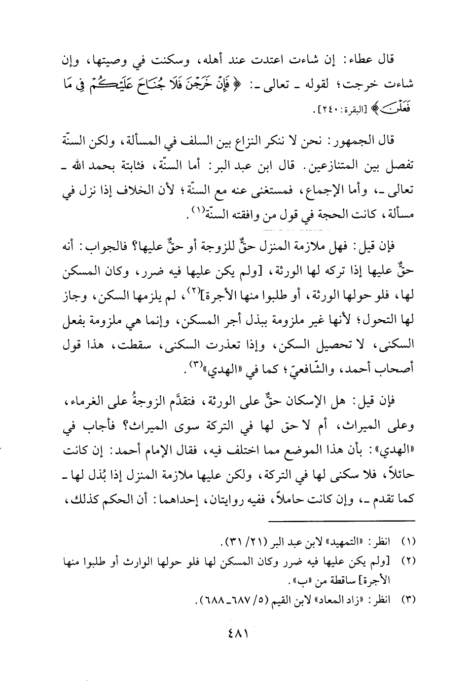 فإن قيل: فهل ملازمة المنزل حقٌّ للزوجة أو حقٌّ عليها؟ فالجواب: أنه حقٌّ عليها إذا تركه لها الورثة، [ولم يكن عليها فيه ضرر، وكان المسكن لها، فلو حولها الورثة، أو طلبوا منها الأجرة] (٢)، لم يلزمها السكن، وجاز لها التحول؛ لأنها غير ملزومة ببذل أجر المسكن، وإنما هي ملزومة بفعل السكنى، لا تحصيل السكن، وإذا تعذرت السكنى، سقطت، هذا قول أصحاب أحمد، والشّافعيّ، كما في "الهدي" (٣).