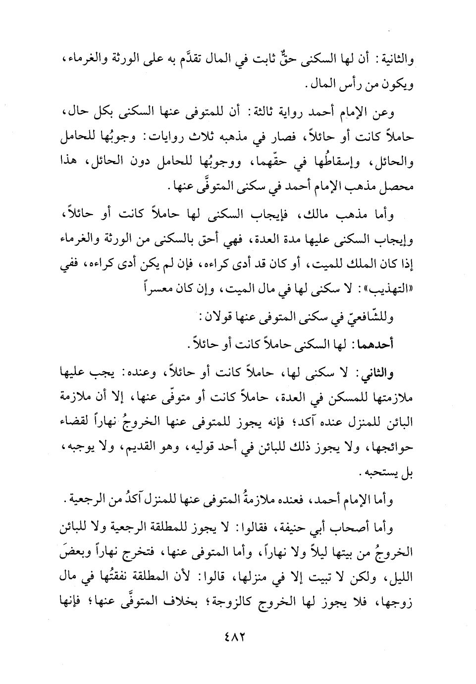 وعن الإمام أحمد رواية ثالثة: أن للمتوفى عنها السكنى بكل حال، حاملًا كانت أو حائلًا، فصار في مذهبه ثلاث روايات: وجوبُها للحامل والحائل، وإسقاطُها في حقّهما، ووجوبُها للحامل دون الحائل، هذا محصل مذهب الإمام أحمد في سكنى المتوفَّى عنها.