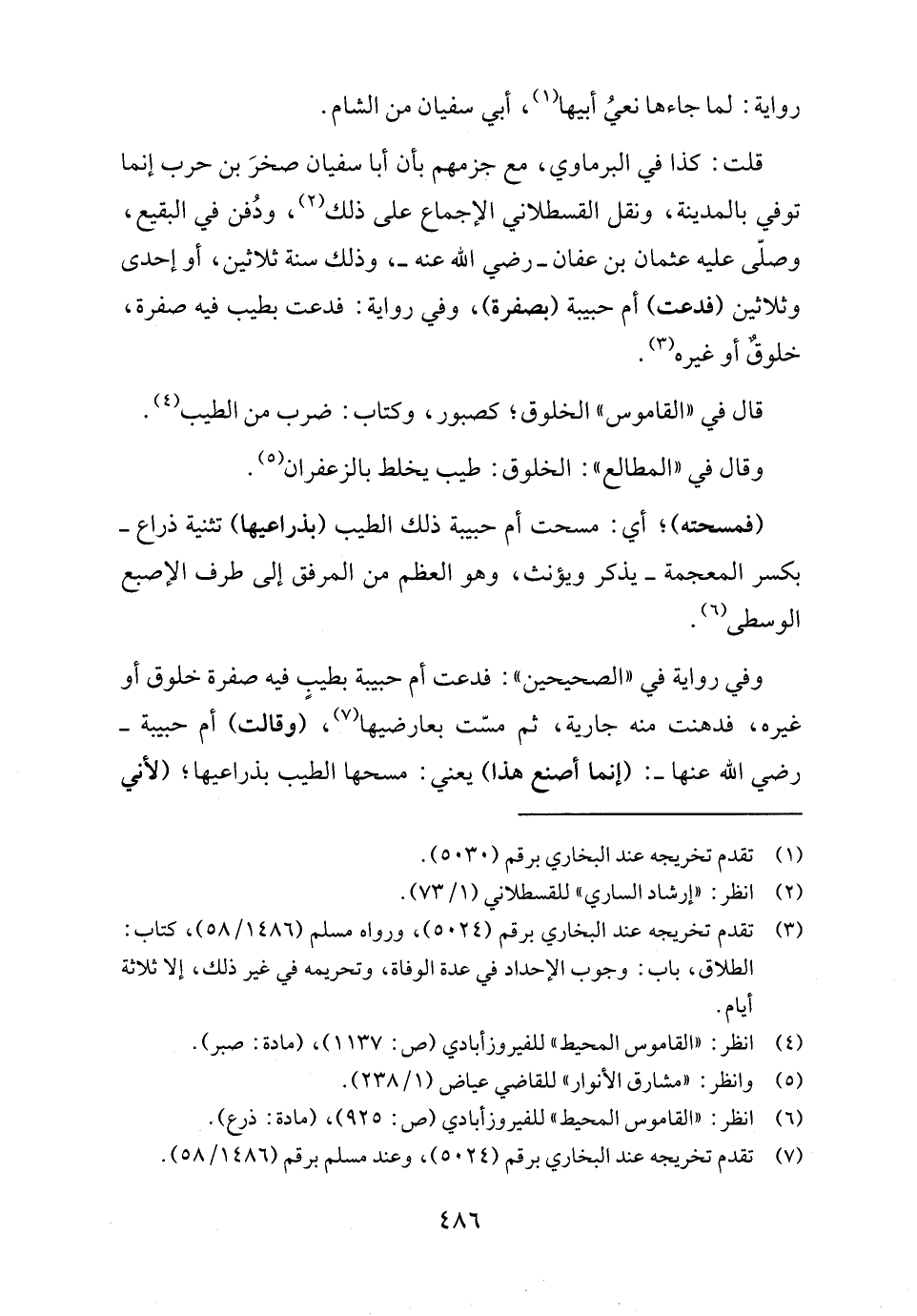 قلت: كذا في البرماوي، مع جزمهم بأن أبا سفيان صخرَ بن حرب إنما توفي بالمدينة، ونقل القسطلاني الإجماع على ذلك (٢)، ودُفن في البقيع، وصلّى عليه عثمان بن عفان - رضي الله عنه -، وذلك سنة ثلاثين، أو إحدى وثلاثين (فدعت) أم حبيبة (بصفرة)، وفي رواية: فدعت بطيب فيه صفرة، خلوقٌ أو غيره (٣).