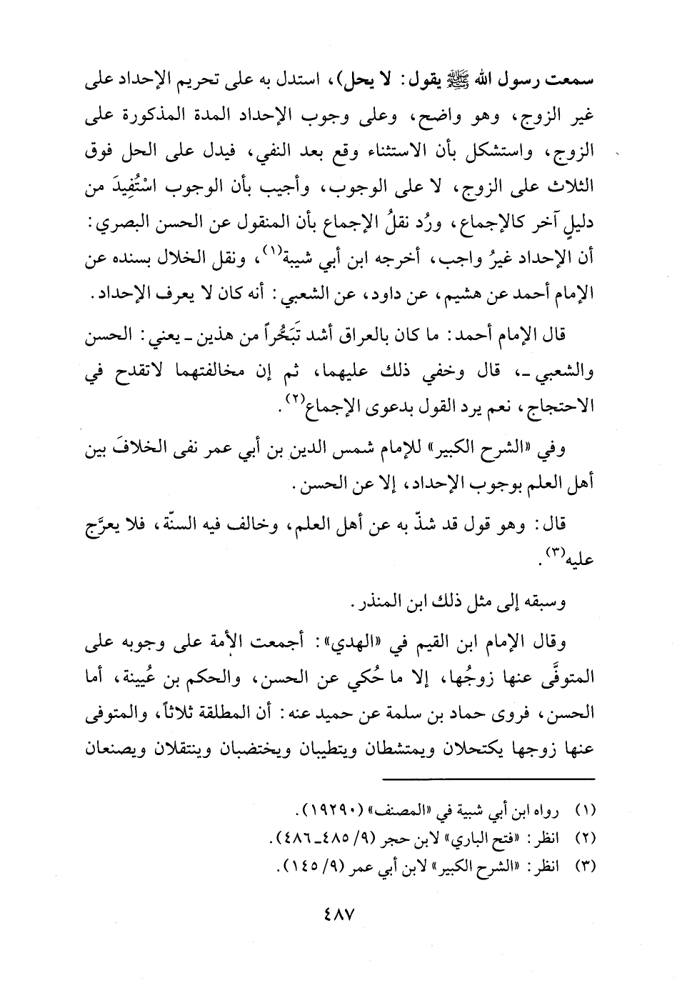 وفي "الشرح الكبير" للإمام شمس الدين بن أبي عمر نفى الخلافَ بين أهل العلم بوجوب الإحداد، إلا عن الحسن.