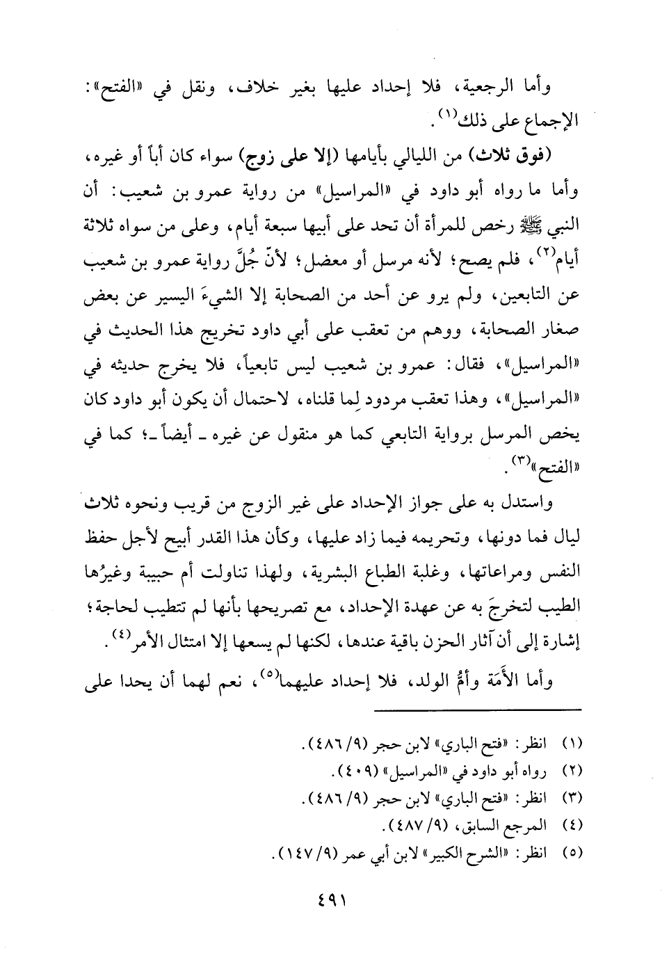 (فوق ثلاث) من الليالي بأيامها (إلا على زوج) سواء كان أبًا أو غيره، وأما ما رواه أبو داود في "المراسيل" من رواية عمرو بن شعيب: أن النبي - صلى الله عليه وسلم - رخص للمرأة أن تحد على أبيها سبعة أيام، وعلى من سواه ثلاثة أيام (٢)، فلم يصح؛ لأنه مرسل أو معضل؛ لأنّ جُلَّ رواية عمرو بن شعيب عن التابعين، ولم يرو عن أحد من الصحابة إلا الشيءَ اليسير عن بعض صغار الصحابة، ووهم من تعقب على أبي داود تخريج هذا الحديث في "المراسيل"، فقال: عمرو بن شعيب ليس تابعيًا، فلا يخرج حديثه في "المراسيل"، وهذا تعقب مردود لِما قلناه، لاحتمال أن يكون أبو داود كان يخص المرسل برواية التابعي كما هو منقول عن غيره -أيضًا-، كما في "الفتح" (٣).