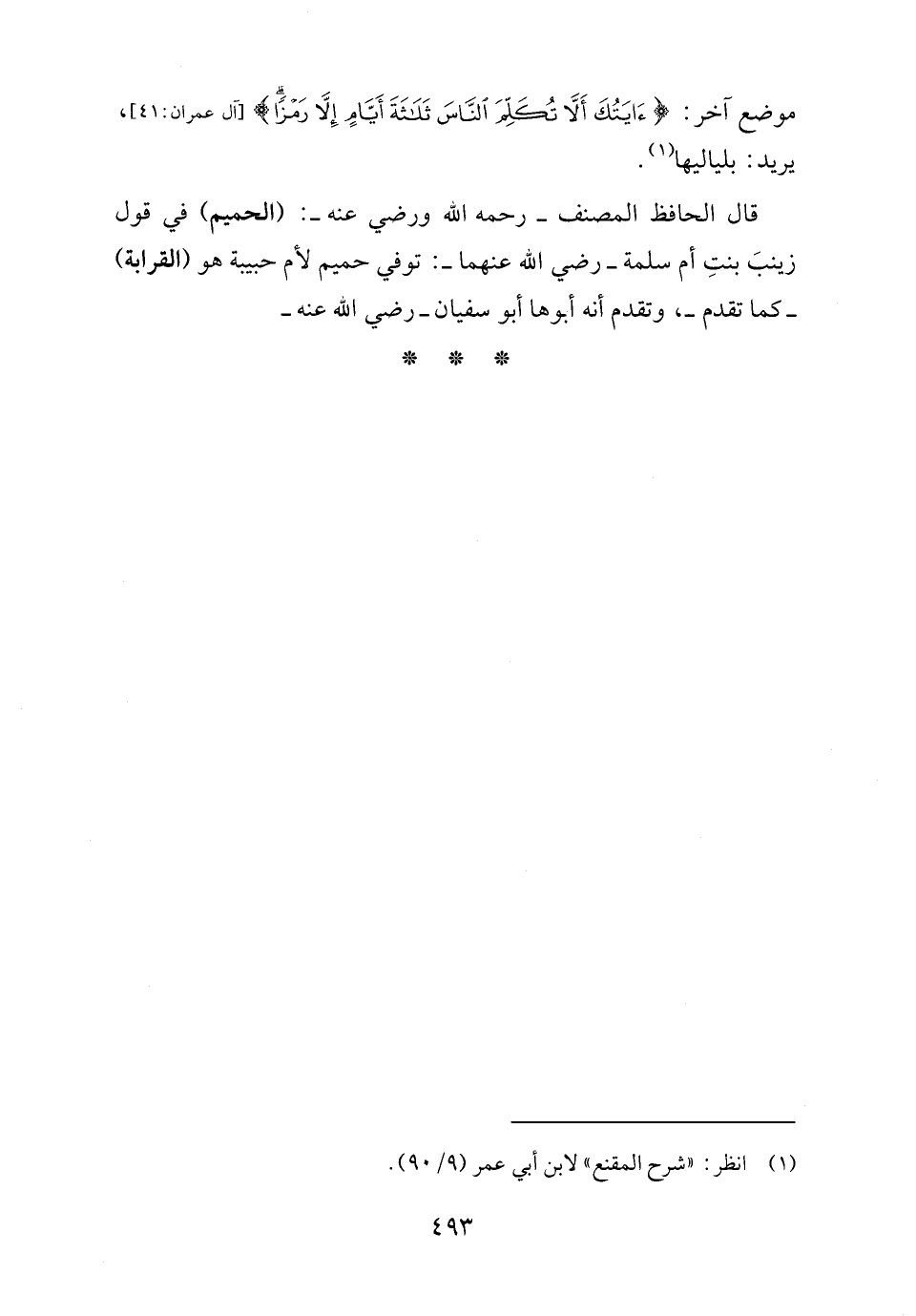 قال الحافظ المصنف -رحمه الله ورضي عنه-: (الحميم) في قول زينب بنت أم سلمة - رضي الله عنهما -: توفي حميم لأم حبيبة هو (القرابة) -كما تقدم-، وتقدم أنه أبوها أبو سفيان - رضي الله عنه -