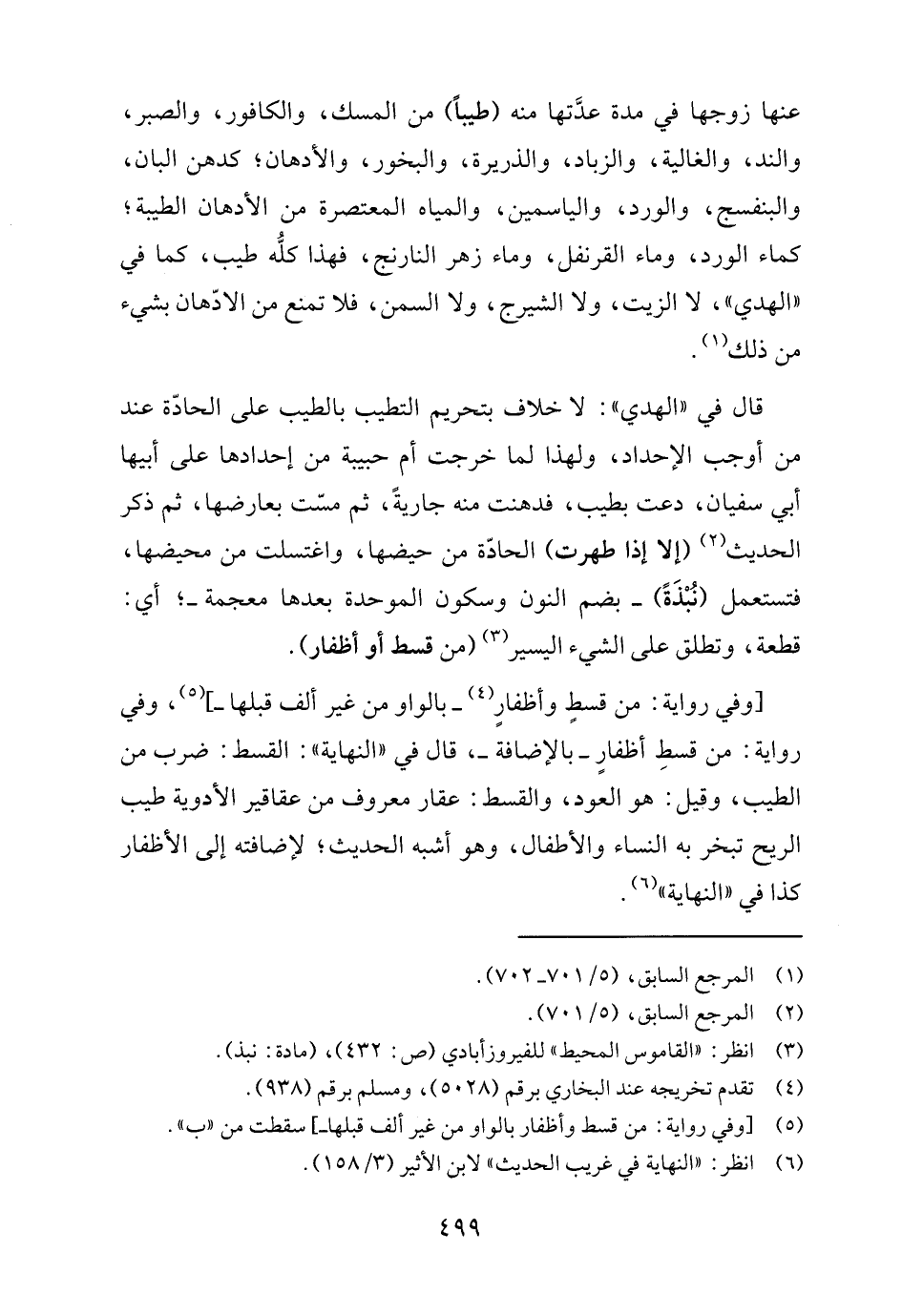 عنها زوجها في مدة عدَّتها منه (طيبًا) من المسك، والكافور، والصبر، والند، والغالية، والزباد، والذريرة، والبخور، والأدهان، كدهن البان، والبنفسج، والورد، والياسمين، والمياه المعتصرة من الأدهان الطيبة، كماء الورد، وماء القرنفل، وماء زهر النارنج، فهذا كلُّه طيب، كما في "الهدي"، لا الزيت، ولا الشيرج، ولا السمن، فلا تمنع من الادّهان بشيء من ذلك (١).