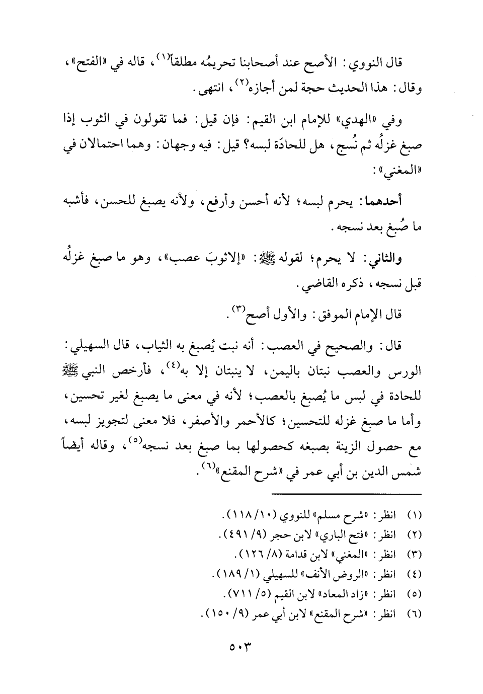 وفي "الهدي" للإمام ابن القيم: فإن قيل: فما تقولون في الثوب إذا صبغ غزلُه ثمّ نُسج، هل للحادّة لبسه؟ قيل: فيه وجهان: وهما احتمالان في "المغني":