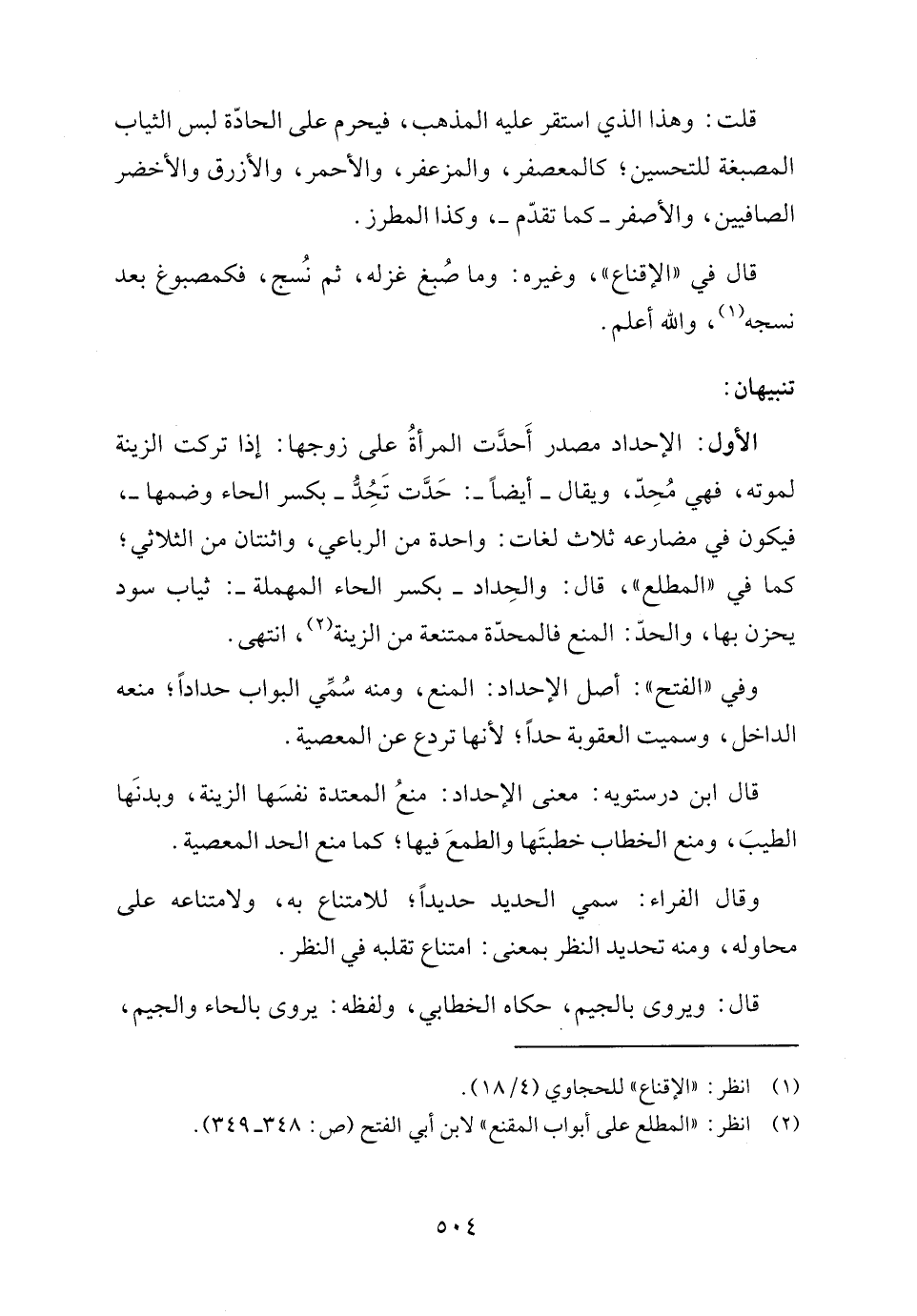 الأول: الإحداد مصدر أَحدَّت المرأةُ على زوجها: إذا تركت الزينة لموته، فهي مُحِدّ، ويقال -أيضًا-: حَدَّت تَحُدُّ -بكسر الحاء وضمها-، فيكون في مضارعه ثلاث لغات: واحدة من الرباعي، واثنتان من الثلاثي، كما في "المطلع"، قال: والحِداد -بكسر الحاء المهملة-: ثياب سود يحزن بها، والحدّ: المنع فالمحدّة ممتنعة من الزينة (٢)، انتهى.