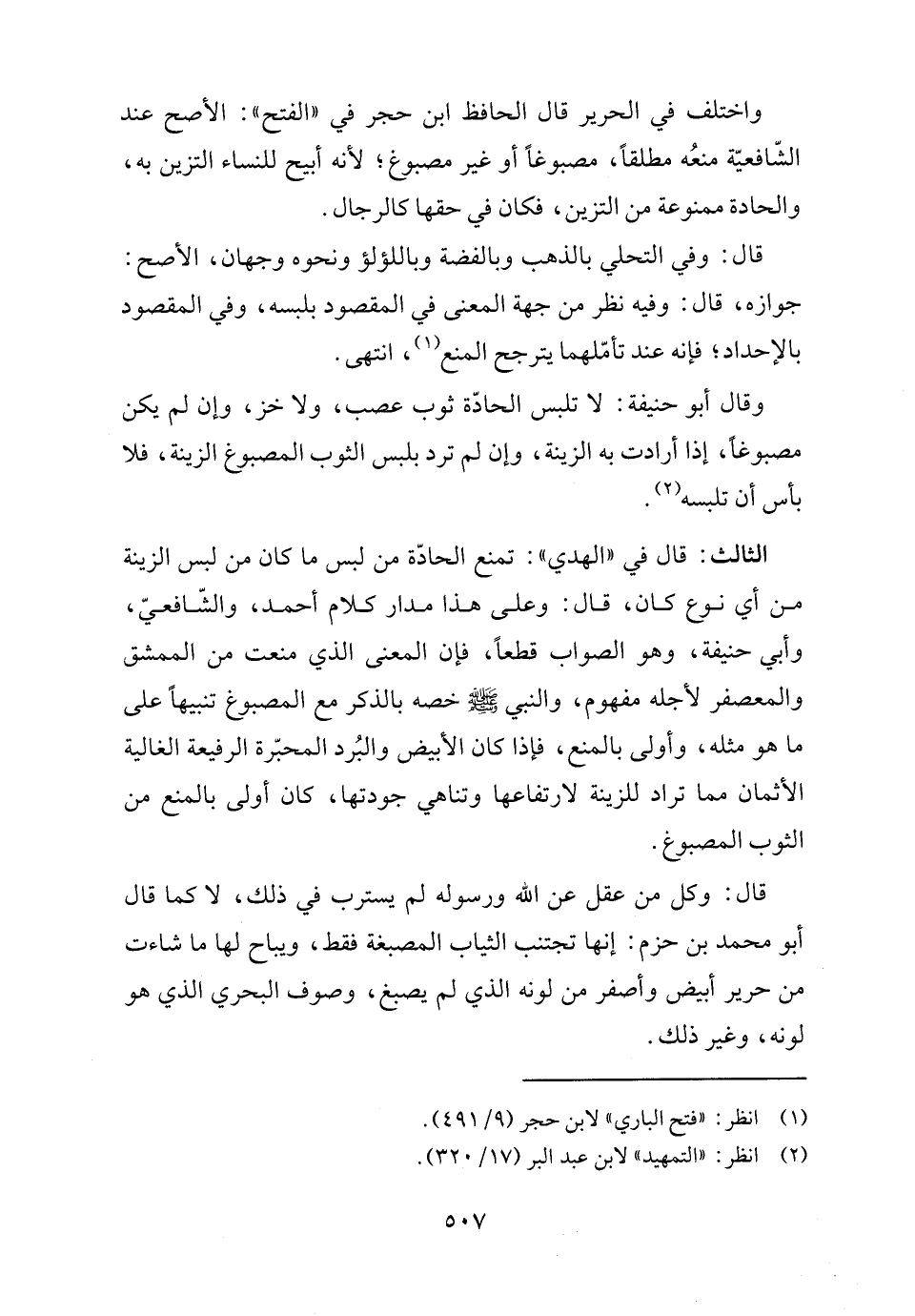 الثالث: قال في "الهدي": تمنع الحادّة من لبس ما كان من لبس الزينة من أي نوع كان، قال: وعلى هذا مدار كلام أحمد، والشّافعيّ، وأبي حنيفة، وهو الصواب قطعًا، فإن المعنى الذي منعت من الممشق والمعصفر لأجله مفهوم، والنبي - صلى الله عليه وسلم - خصه بالذكر مع المصبوغ تنبيهًا على ما هو مثله، وأولى بالمنع، فإذا كان الأبيض والبُرد المحبّرة الرفيعة الغالية الأثمان مما تراد للزينة لارتفاعها وتناهي جودتها، كان أولى بالمنع من الثوب المصبوغ.