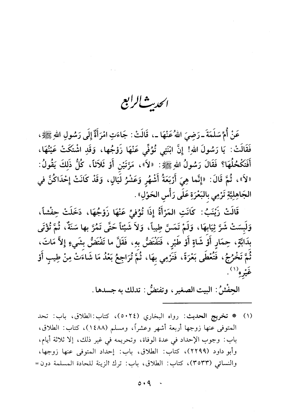 عَنْ أُمِّ سَلَمَةَ - رَضِيَ اللهُ عَنْهَا -، قَالَتْ: جَاءَتِ امْرَأَةٌ إِلَى رَسُولِ اللهِ - صلى الله عليه وسلم -، فَقَالَتْ: يَا رَسُولَ اللهِ! إِنَّ ابْنَتِي تُوُفِّي عَنْهَا زَوْجُها، وَقَدِ اشْتكتْ عَيْنُهَا، أَفَتَكْحُلُهَا؟ فَقَالَ رَسُولُ اللهِ - صلى الله عليه وسلم -: "لَا"، مَرَّتَيْنِ أَوْ ثَلَاثًا، كلُّ ذَلِكَ يَقُولُ: "لَا"، ثُمَّ قَالَ: "إِنَّما هِيَ أَرْبَعَةُ أَشْهُرٍ وَعَشْرُ لَيَالٍ، وَقَدْ كَانَتْ إِحْدَاكُنَّ في الجَاهِلِيَّةِ تَرْمِي بِالبَعْرَةِ عَلَى رَأْسِ الحَوْلِ".