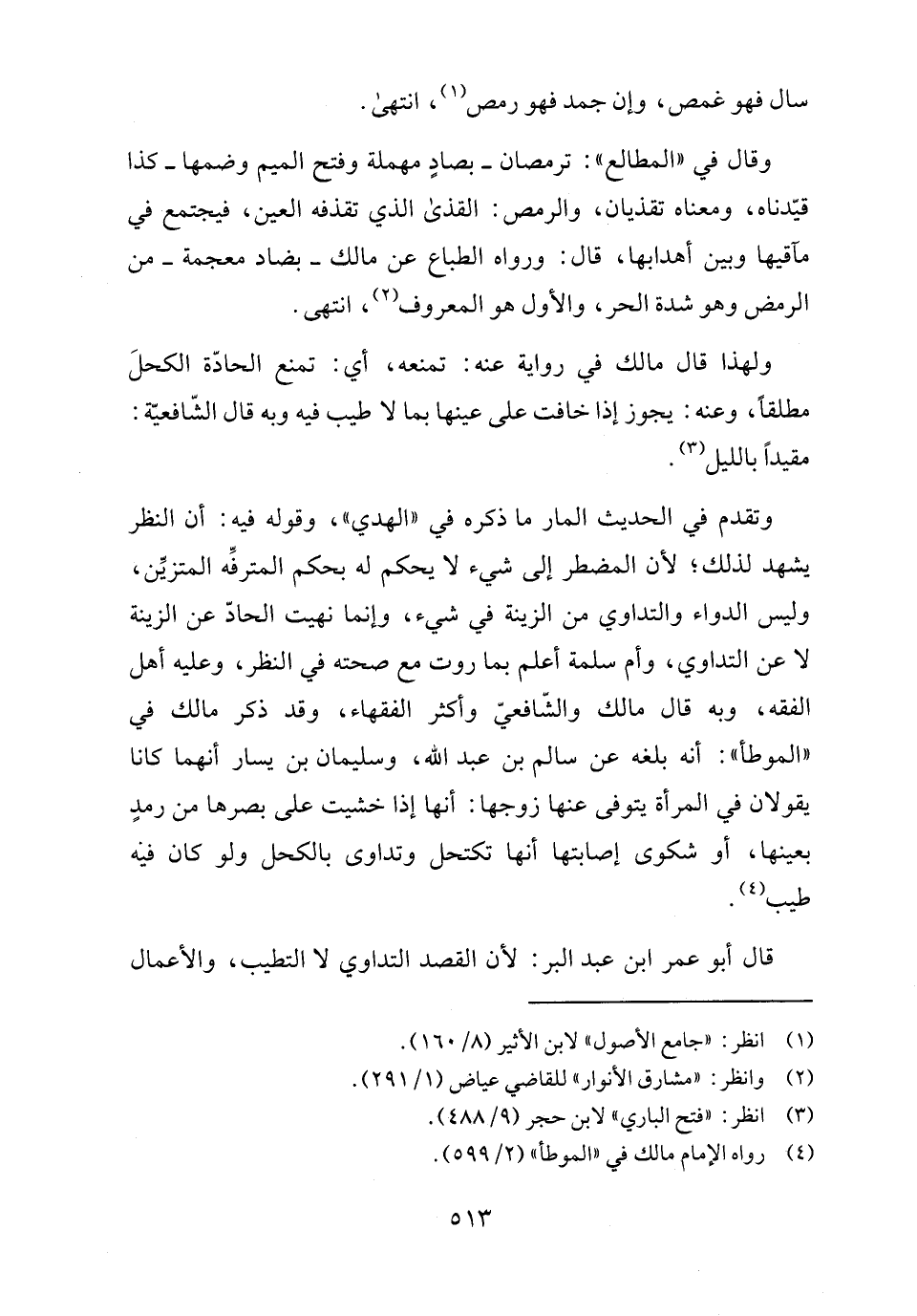 وتقدم في الحديث المار ما ذكره في "الهدي"، وقوله فيه: أن النظر يشهد لذلك؛ لأن المضطر إلى شيء لا يحكم له بحكم المترفِّه المتزيِّن، وليس الدواء والتداوي من الزينة في شيء، وإنما نهيت الحادّ عن الزينة لا عن التداوي، وأم سلمة أعلم بما روت مع صحته في النظر، وعليه أهل الفقه، وبه قال مالك والشّافعيّ وأكثر الفقهاء، وقد ذكر مالك في "الموطأ": أنه بلغه عن سالم بن عبد الله، وسليمان بن يسار أنهما كانا يقولان في المرأة يتوفى عنها زوجها: أما إذا خشيت على بصرها من رمدٍ بعينها، أو شكوى إصابتها أما تكتحل وتداوى بالكحل ولو كان فية طيب (٤).