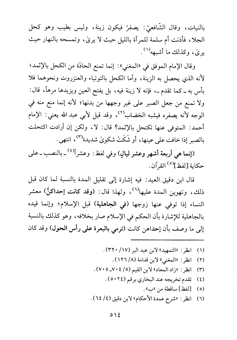 وقال: الإمام الموفق في "المغني": إنما تمنع الحادّة من الكحل بالإثمد؛ لأنه الذي يحصل به الزينة، وأما الكحل بالتوتياء والعنزروت ونحوهما فلا بأس به -كما تقدم-، فإنه لا زينة فيه، بل يفتح العين ويزيدها مرهًا، قال: ولا تمنع من جعل الصبر على غير وجهها من بدنها؛ لأنه إنما منع منه في الوجه لأنه يصفره فيشبه الخضاب (٢)، وقد قيل لأبي عبد الله يعني: الإمام أحمد: المتوفى عنها تكتحل بالإثمد؟ قال: لا، ولكن إن أرادت اكتحلت بالصبر إذا خافت على عينها، أو شَكَتْ شكوى شديدة (٣)، انتهى.