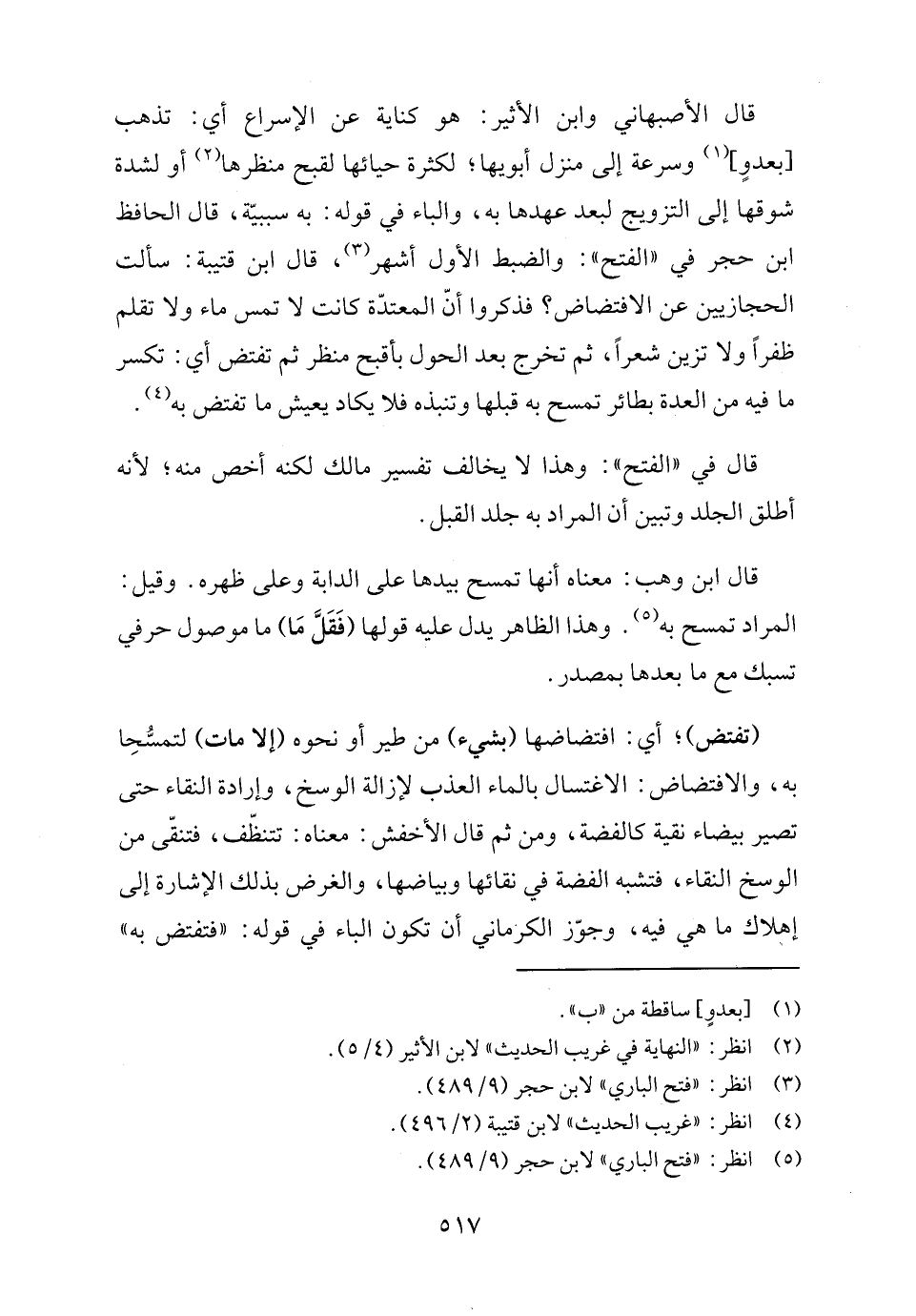 قال الأصبهاني وابن الأثير: هو كناية عن الإسراع أي: تذهب [بعدوٍ] (١) وسرعة إلى منزل أبويها، لكثرة حيائها لقبح منظرها (٢) أو لشدة شوقها إلى التزويج لبعد عهدها به، والباء في قوله: به سببيّة، قال الحافظ ابن حجر في "الفتح": والضبط الأول أشهر (٣)، قال ابن قتيبة: سألت الحجازيين عن الافتضاض؟ فذكروا أنّ المعتدّة كانت لا تمس ماء ولا تقلم ظفرًا ولا تزين شعرًا، ثم تخرج بعد الحول بأقبح منظر ثم تفتض أي: تكسر ما فيه من العدة بطائر تمسح به قبلها وتنبذه فلا يكاد يعيش ما تفتض به (٤).