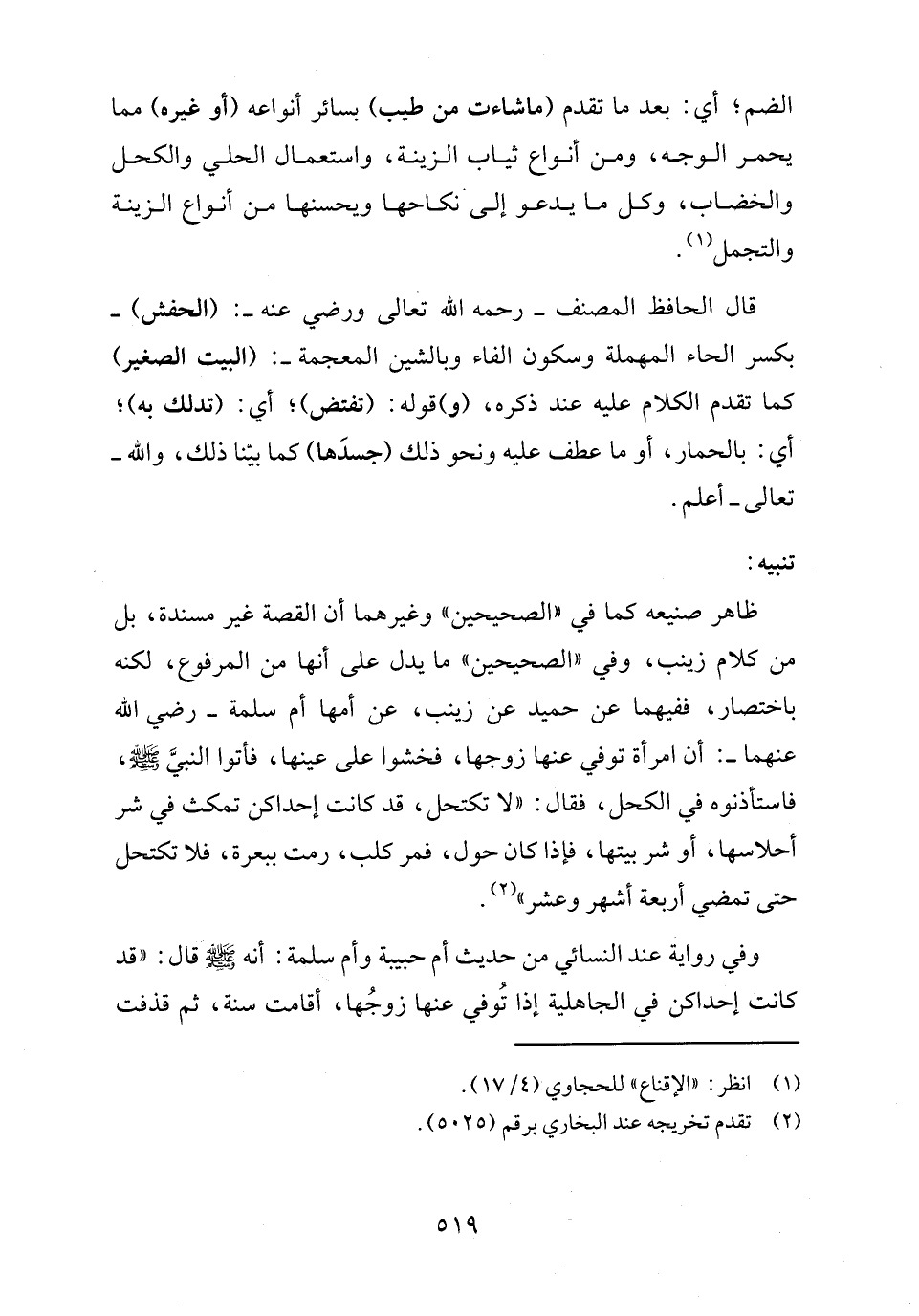 ظاهر صنيعه كما في "الصحيحين" وغيرهما أن القصة غير مسندة، بل من كلام زينب، وفي "الصحيحين" ما يدل على أنها من المرفوع، لكنه باختصار، ففيهما عن حميد عن زينب، عن أمها أم سلمة - رضي الله عنهما -: أن امرأة توفي عنها زوجها، فخشوا على عينها، فأتوا النبيَّ - صلى الله عليه وسلم -، فاستأذنوه في الكحل، فقال: "لا تكتحل، قد كانت إحداكن تمكث في شر أحلاسها، أو شر بيتها، فإذا كان حول، فمر كلب، رمت ببعرة، فلا تكتحل حتى تمضي أربعة أشهر وعشر" (٢).
