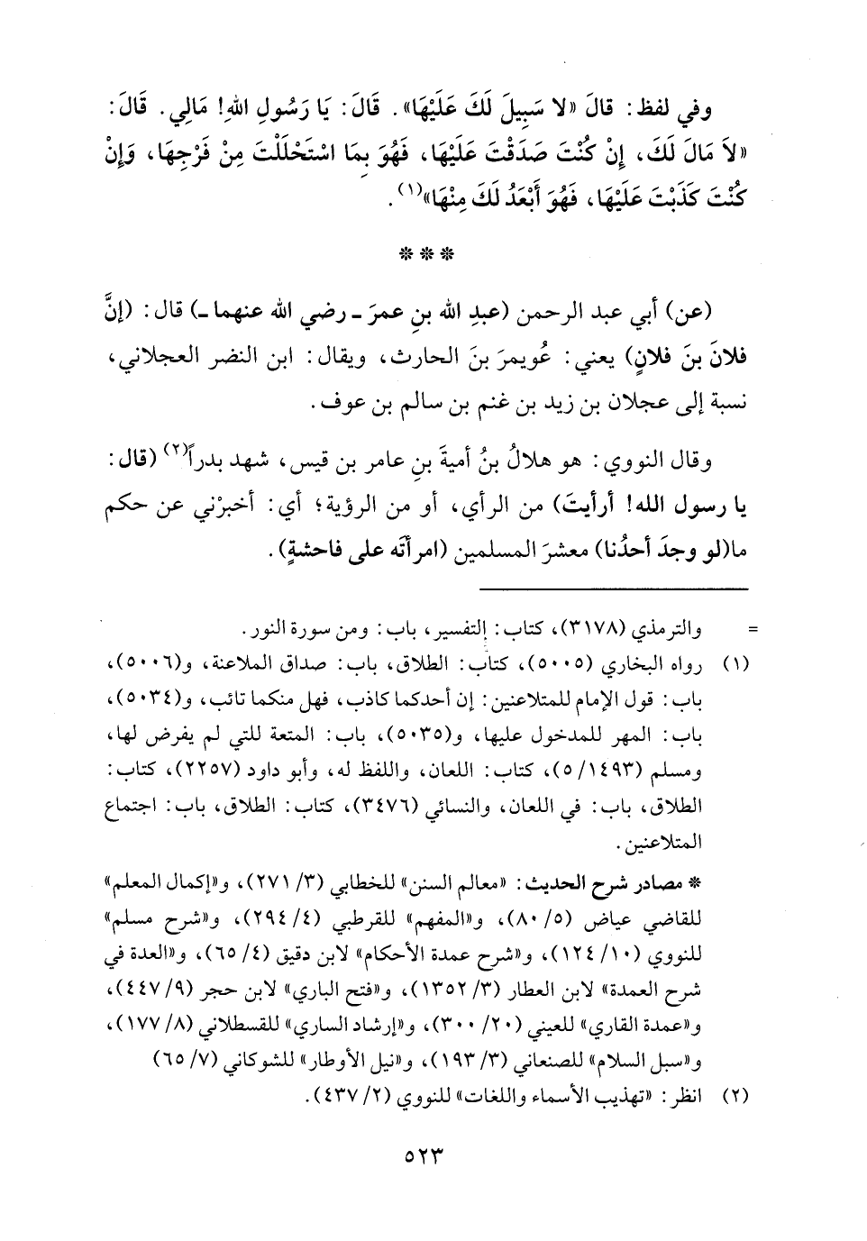 (١) رواه البخاري (٥٠٠٥)، كتاب: الطلاق، باب: صداق الملاعنة، و (٥٠٠٦)، باب: قول الإمام للمتلاعنين: إن أحدكما كاذب، فهل منكما تائب، و (٥٠٣٤)، باب: المهر للمدخول عليها، و (٥٠٣٥)، باب: المتعة للتي لم يفرض لها، ومسلم (١٤٩٣/ ٥)، كتاب: اللعان، واللفظ له، وأبو داود (٢٢٥٧)، كتاب: الطلاق، باب: في اللعان، والنسائي (٣٤٧٦)، كتاب: الطلاق، باب: اجتماع المتلاعنين.