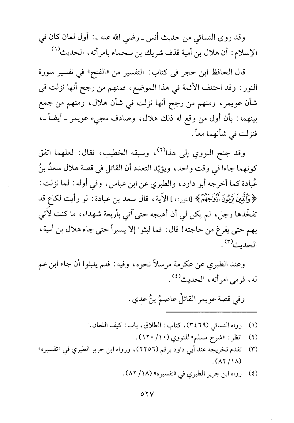 قال الحافظ ابن حجر في كتاب: التفسير من "الفتح" في تفسير سورة النور: وقد اختلف الأئمة في هذا الموضع، فمنهم من رجح أنها نزلت في شأن عويمر، ومنهم من رجح أنها نزلت في شأن هلال، ومنهم من جمع بينهما: بأن أول من وقع له ذلك هلال، وصادف مجيء عويمر -أيضًا-، فنزلت في شأنهما معًا.