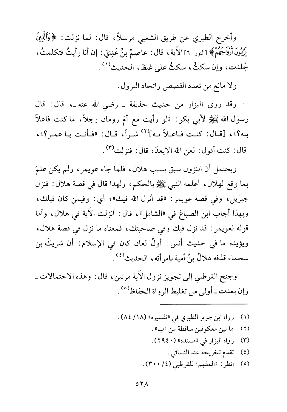 وجنح القرطبي إلى تجويز نزول الآية مرتين، قال: وهذه الاحتمالات -وإن بعدت- أولى من تغليط الرواة الحفاظ (٥).