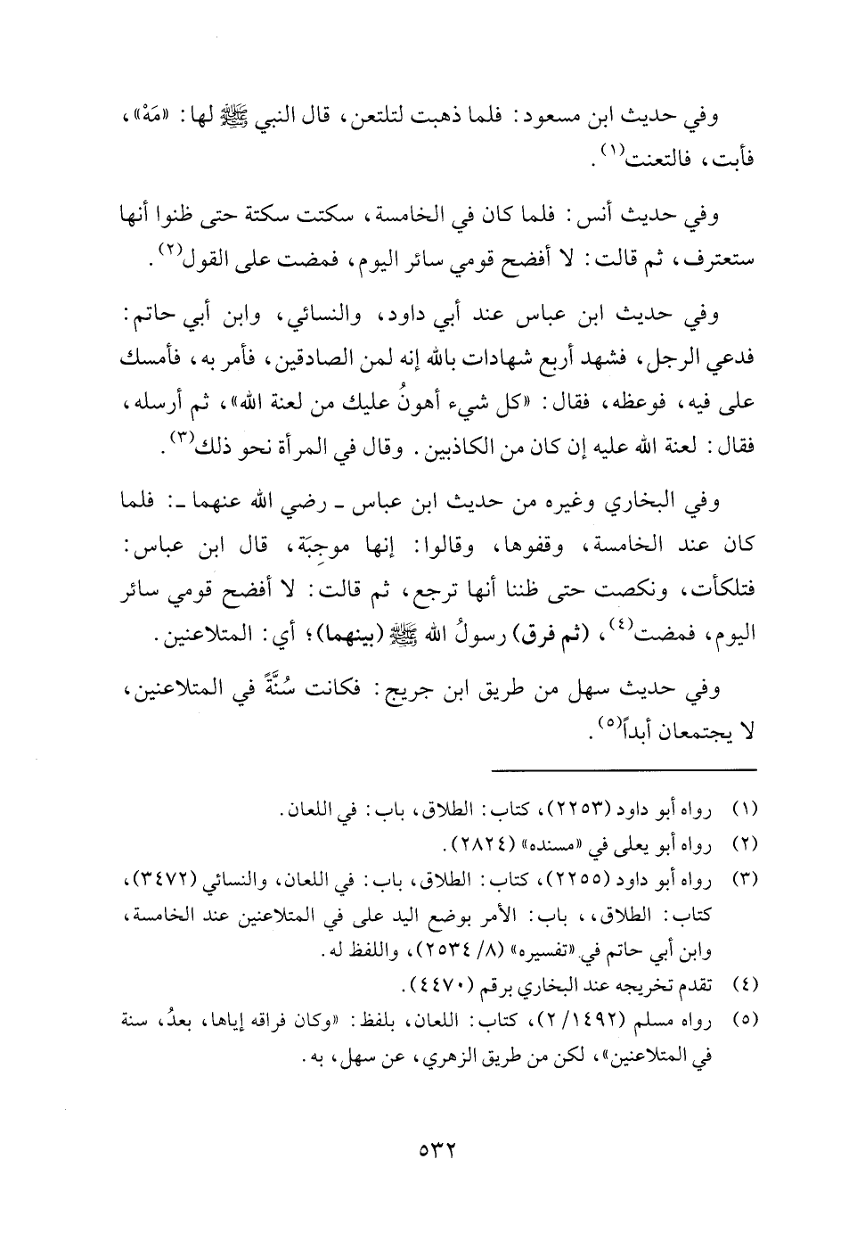(٥) رواه مسلم (١٤٩٢/ ٢)، كتاب: اللعان، بلفظ: "وكات فراقه إياها، بعدُ، سنة في المتلاعنين"، لكن من طريق الزهري، عن سهل، به.