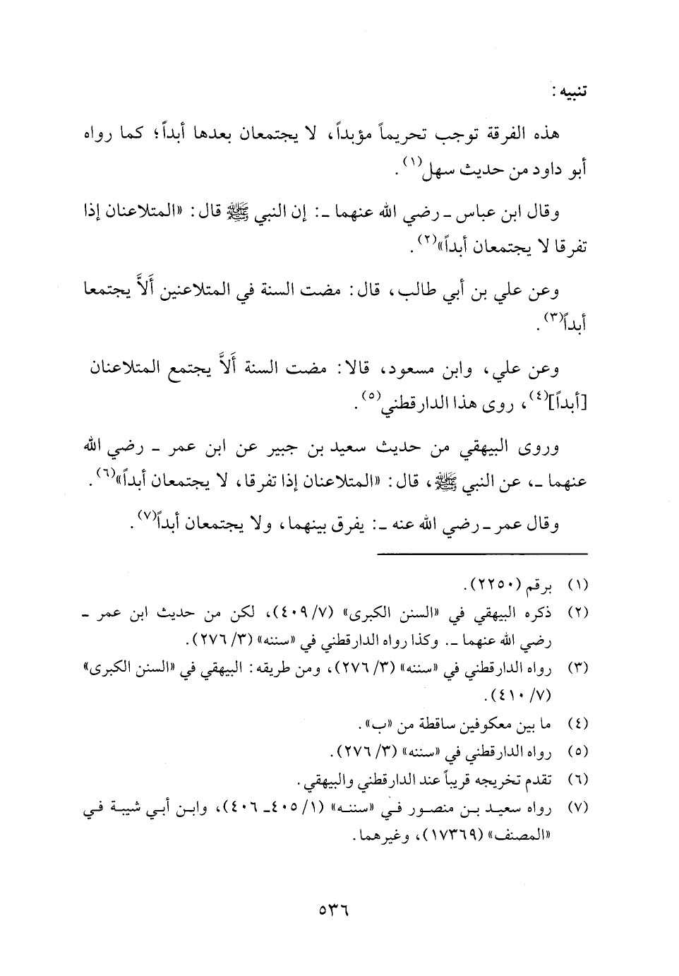 وروى البيهقي من حديث سعيد بن جبير عن ابن عمر - رضي الله عنهما -، عن النبي - صلى الله عليه وسلم -، قال: "المتلاعنان إذا تفرقا، لا يجتمعان أبدًا" (٦).