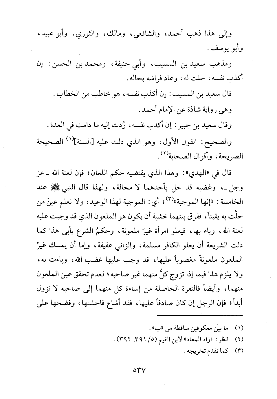 ومذهب سعيد بن المسيب، وأبي حنيفة، ومحمد بن الحسن: إن أكذب نفسه، حلت له، وعاد فراشه بحاله.