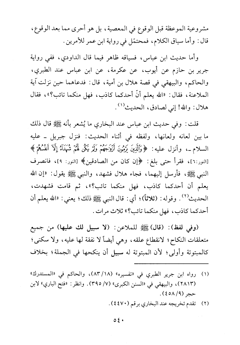 وأما حديث ابن عباس، فسياقه ظاهر فيما قال الداودي، ففي رواية جرير بن حازم عن أيوب، عن عكرمة، عن ابن عباس عند الطبري، والحاكم، والبيهقي في قصة هلال بن أمية، قال: فدعاهما حين نزلت آية الملاعنة، فقال: "الله يعلم أن أحدكما كاذب، فهل منكما تائب؟ "، فقال هلال: والله! إني لصادق، الحديث (١).