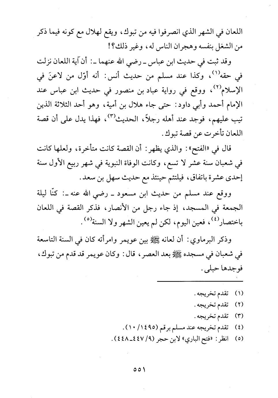 وذكر البرماوي: أن لعانه - صلى الله عليه وسلم - بين عويمر وامرأته كان في السنة التاسعة في شعبان في مسجده - صلى الله عليه وسلم - بعد العصر، قال: وكان عويمر قد قدم من تبوك، فوجدها حبلى.