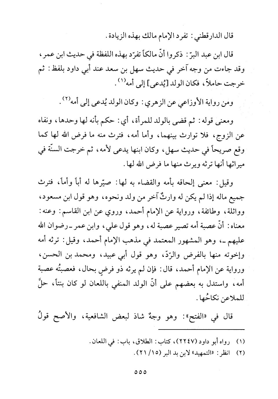 قال ابن عبد البر: ذكروا أنّ مالكًا تفرّد بهذه اللفظة في حديث ابن عمر، وقد جاءت من وجه آخر في حديث سهل بن سعد عند أبي داود بلفظ: ثم خرجت حاملًا، فكان الولد [يُدعى] إلى أمه (١).