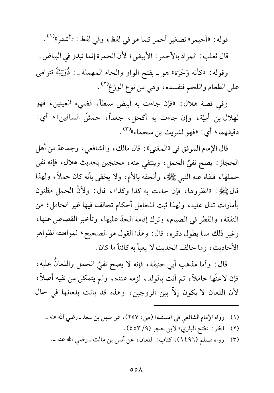 وفي قصة هلال: "فإن جاءت به أبيض سبطًا، قضيء العينين، فهو لهلال بن أميّة، وإن جاءت به أكحل، جعدًا، حمشَ الساقين"؛ أي: دقيقهما؛ أي: "فهو لشريك بن سحماء" (٣).