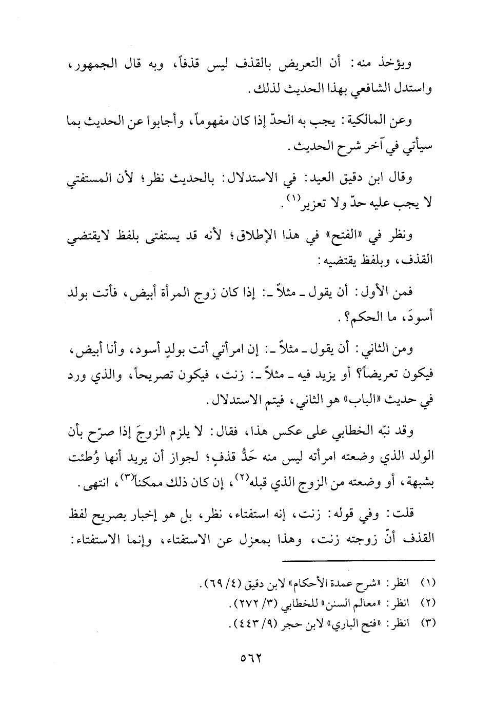 ومن الثاني: أن يقول -مثلًا-: إن امرأتي أتت بولدٍ أسود، وأنا أبيض، فيكون تعريضًا؟ أو يزيد فيه -مثلًا-: زنت، فيكون تصريحًا، والذي ورد في حديث "الباب" هو الثاني، فيتم الاستدلال.