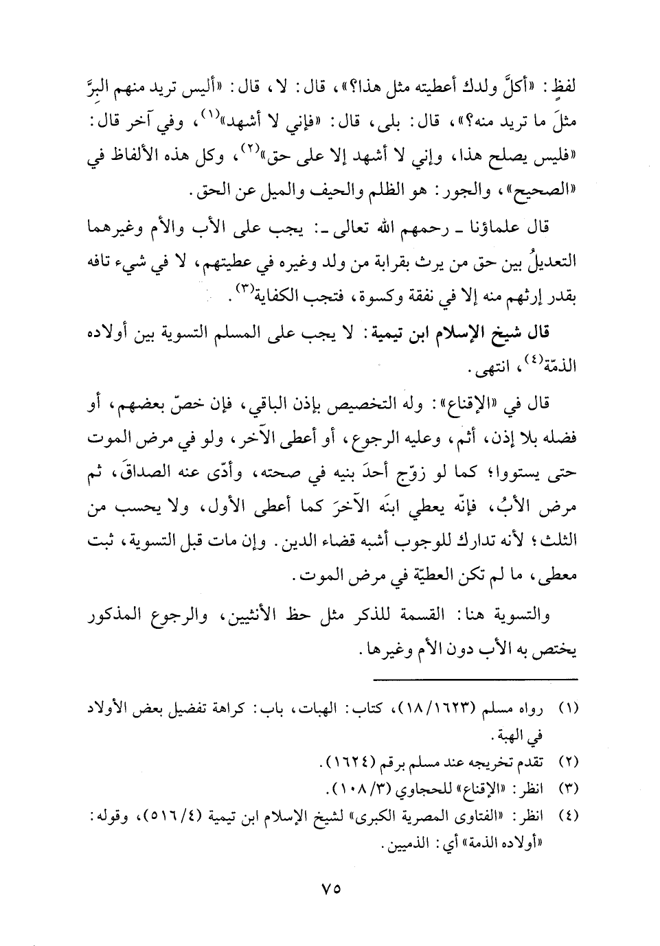 (١) رواه مسلم (١٦٢٣/ ١٨)، كتاب: الهبات، باب: كراهة تفضيل بعض الأولاد في الهبة.