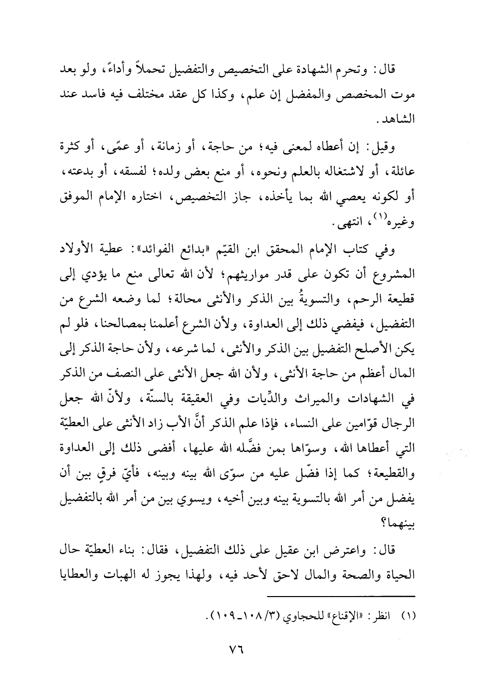 وقيل: إن أعطاه لمعنى فيه، من حاجة، أو زمانة، أو عمًى، أو كثرة عائلة، أو لاشتغاله بالعلم ونحوه، أو منع بعض ولده، لفسقه، أو بدعته، أو لكونه يعصي الله بما يأخذه، جاز التخصيص، اختاره الإمام الموفق وغيره (١)، انتهى.